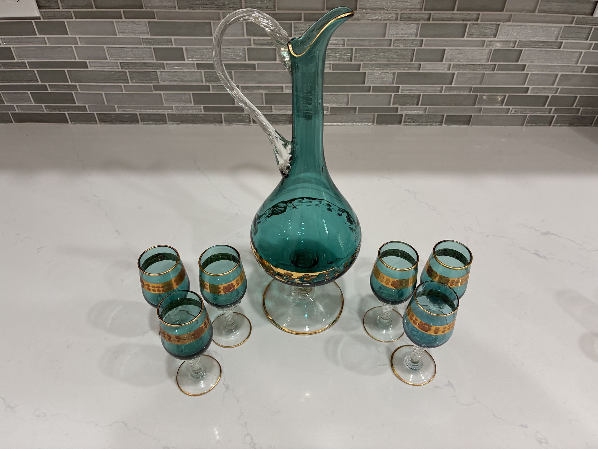 12 1/2 in decanter w/ 6 cordials glasses 4in high ..plus 3 extra purple glasses. No chips no cracks very good condition