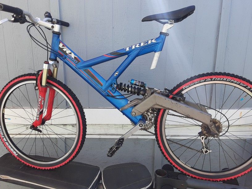 Trek VRX 200 Alpha Full-Suspension Custom Aluminum Light Weight Frame, Fully Independent Link, DHX 5.0 Fox Manitou SC Titanium. Blue and red color frame. Brand new set of Original "Red Line" Panaracer Fire-XC-Pro Tires and Inner tubes installed. Recently Serviced. Very Comfortable Bike!! You Pick South Chula Vista.