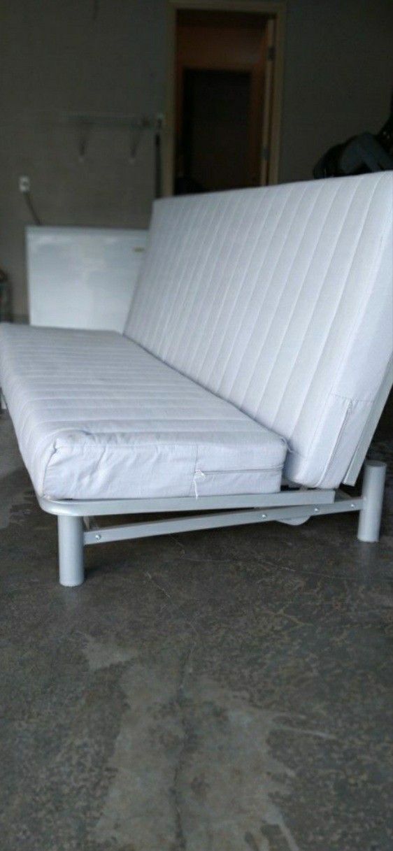 Futon was used in my guest room Metal frame with wooden slats,removable all foam mattress 3 positions in total ,sit up position ,recline position and flat bed position Great condition Flat position: 57"×79"×16"H Sofa position:31"D×41"H×16"H Pickup in spanaway