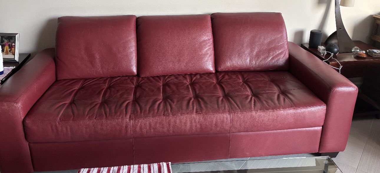 Note: Sofa is not a sofa sleeper sofa. 7ft long. Both the sofa and the recliner are very comfortable & sturdy. In Kings Point Tamarac 33321 Near Nob Hill Rd Btw McNab Rd & Southgate Blvd ——— Sofá de cuero — no es sofá cama. Mide 7 pies. El sofá y el reclinable son muy cómodos y firmes. En Kings Point Tamarac 33321 Cerca de Nob Hill Rd Entre W McNab Rd y Southgate Blvd ——- Sofa kwi — pa sofa kabann. Li 7 pye longè. Sofa a ak recliner la trè konfòtab e solid. Nan Kings Point Tamarac 33321 Toupre Nob Hill Rd Ant W McNab Rd ak Southgate Blvd