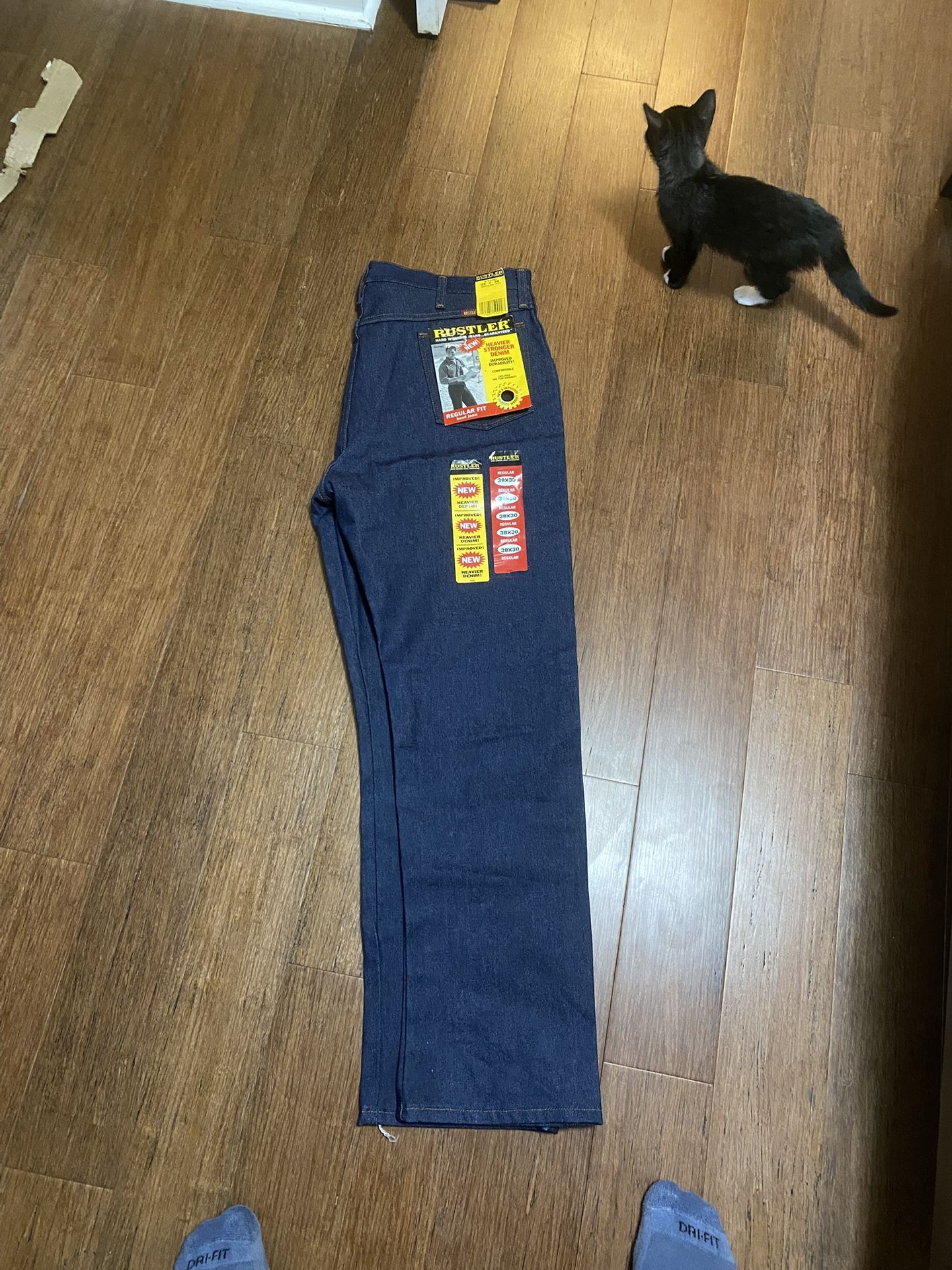 Never worn deadstock rustler jeans. Very thick denim and good quality. 100% cotton.