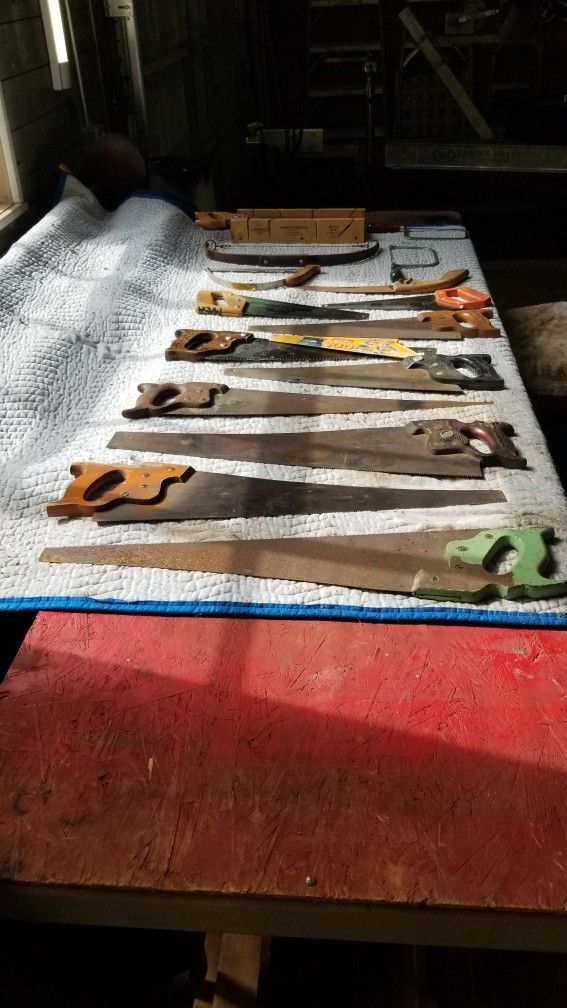 Assorted saws, several are antiques, some are almost new.