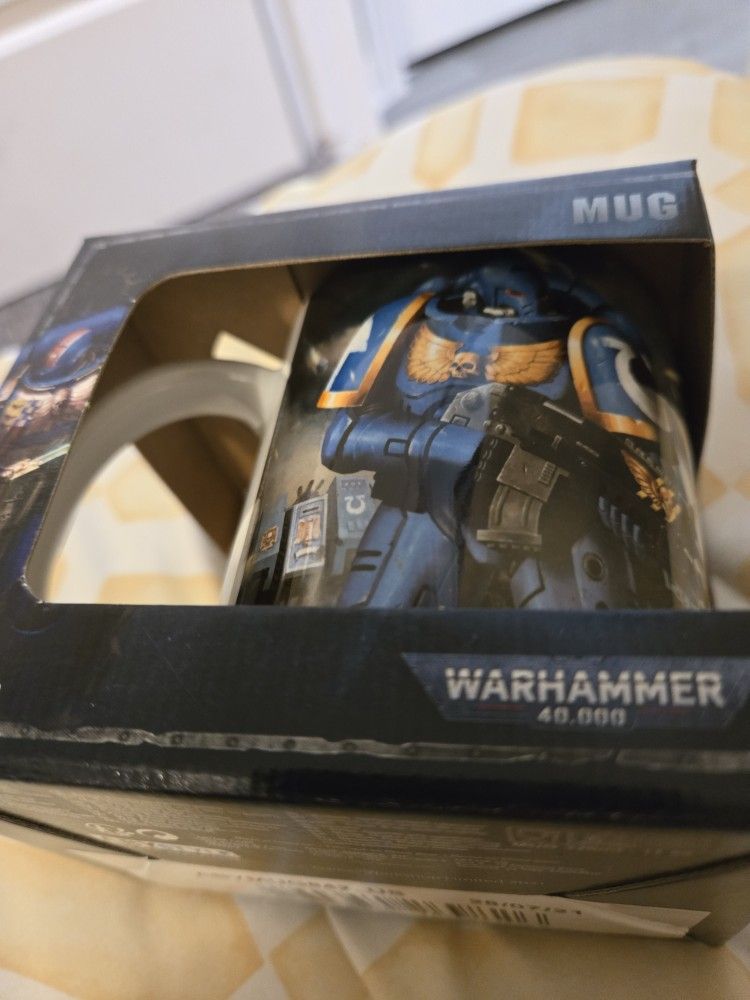This is a Warhammer 40K coffee mug g Feat. Ultramarines, space marines Artwork New in box. Never used. 5$ Cash and pickup only. I am near Austin bluffs, tyvm