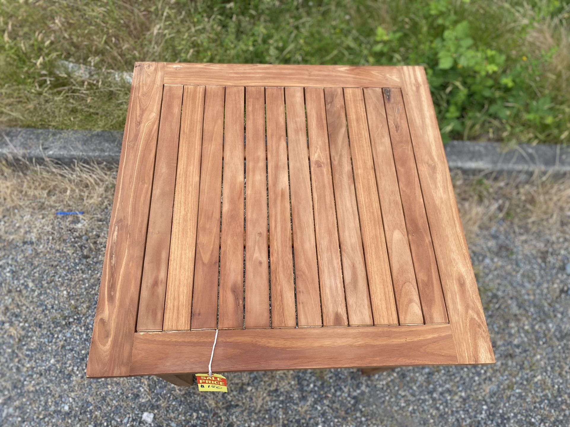 Beautiful and sturdy teak bistro table perfect for summer outdoor dining! Enjoy the sunset and a meal on your deck or in your garden. 32” square top x 30” high $150 (plus tax) Same day pickup in Tacoma