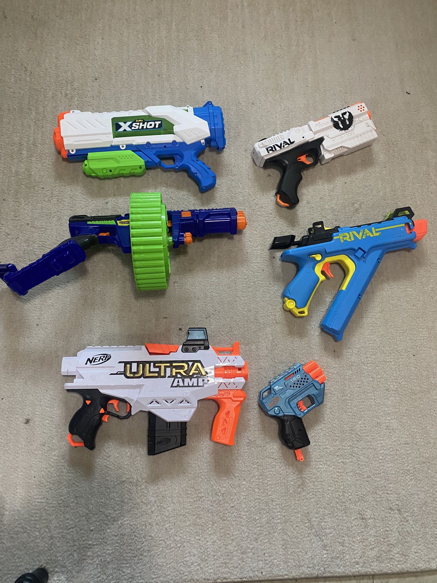 Set of 4 Original Nerf guns -The Ultra Amp is battery powered -one is a water gun -one is generic nerf Priced To Sell
