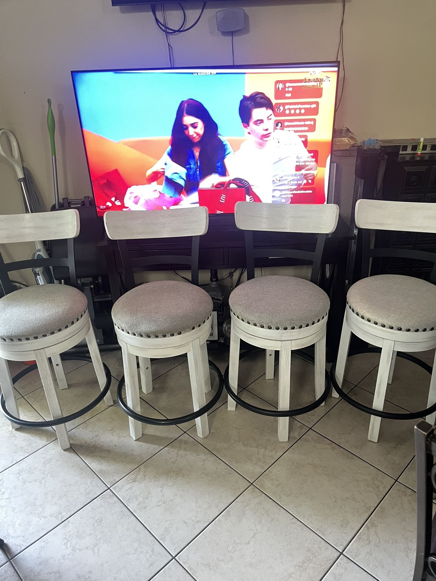 4 taburetes de barra de la marca Ashley están confortables con un acabado turístico de color blanco y negro par decorar tu barra son ba giratorios a 360 grados muy cómodos con una altura de 25 “ Del piso a la esponja muy cómodos
