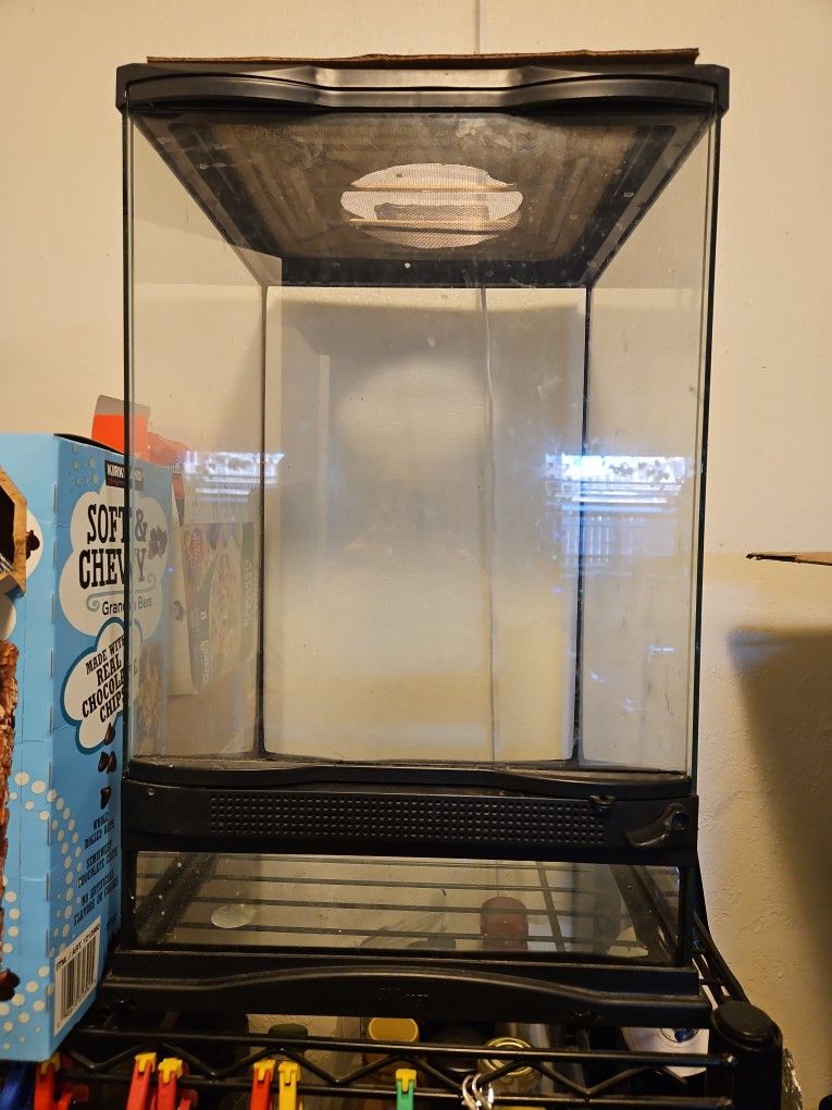Swing door paludarium/ terrarium. Bottom can be filled with water and top turned into a terrestrial terrarium. Removable screen top.