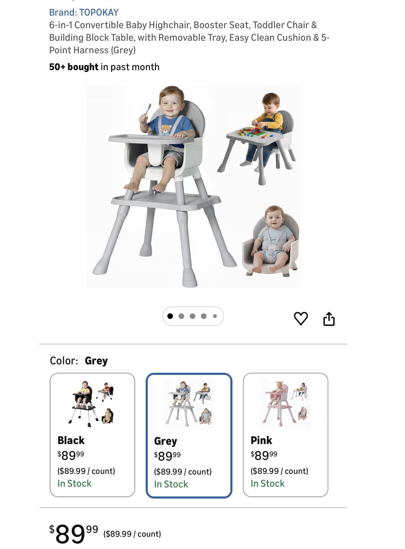 New in box 6-in-1 Convertible Baby Highchair, Booster Seat, Toddler Chair & Building Block Table, with Removable Tray, Easy Clean Cushion & 5-Point Harness (Grey