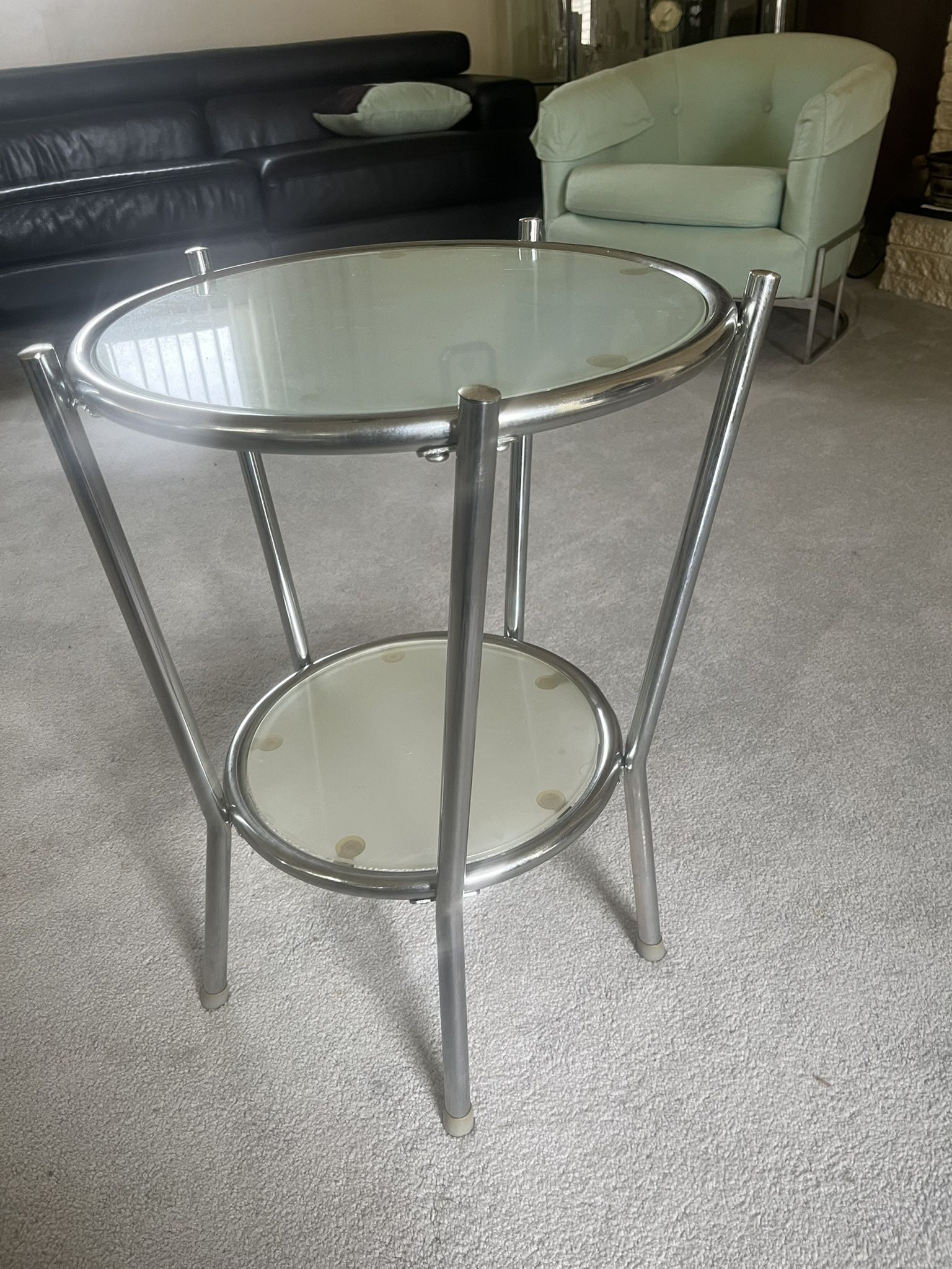 A double glass panel side table. Perfect for a photos showcase or a side snack bar.