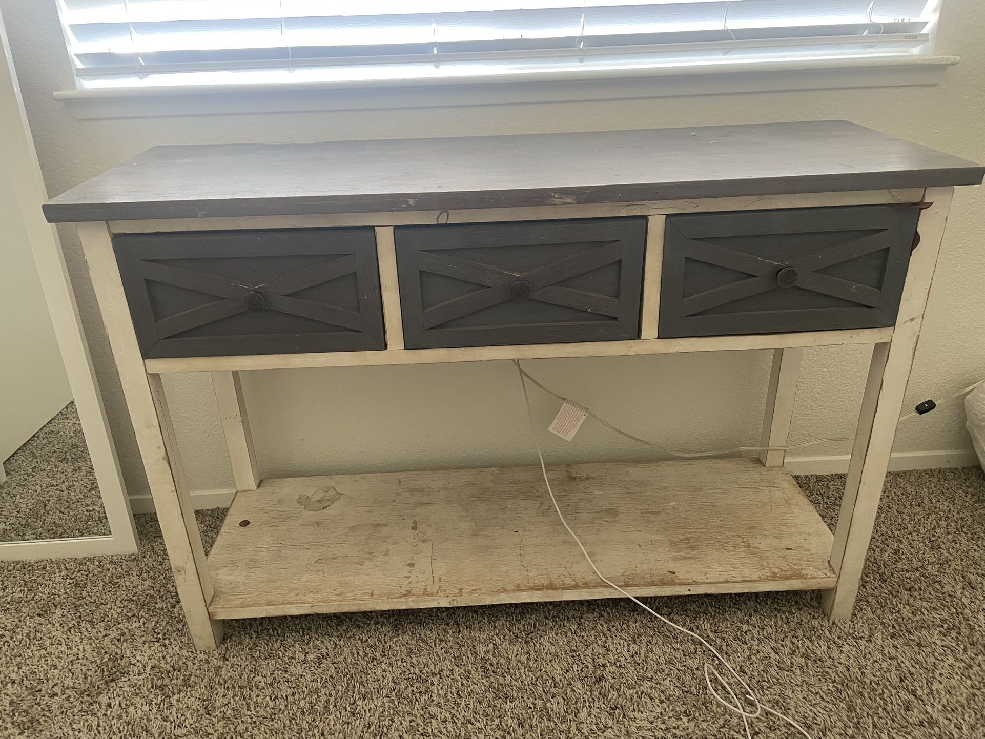 Good condition with rustic and distressed look console table with storage, shelves work good too