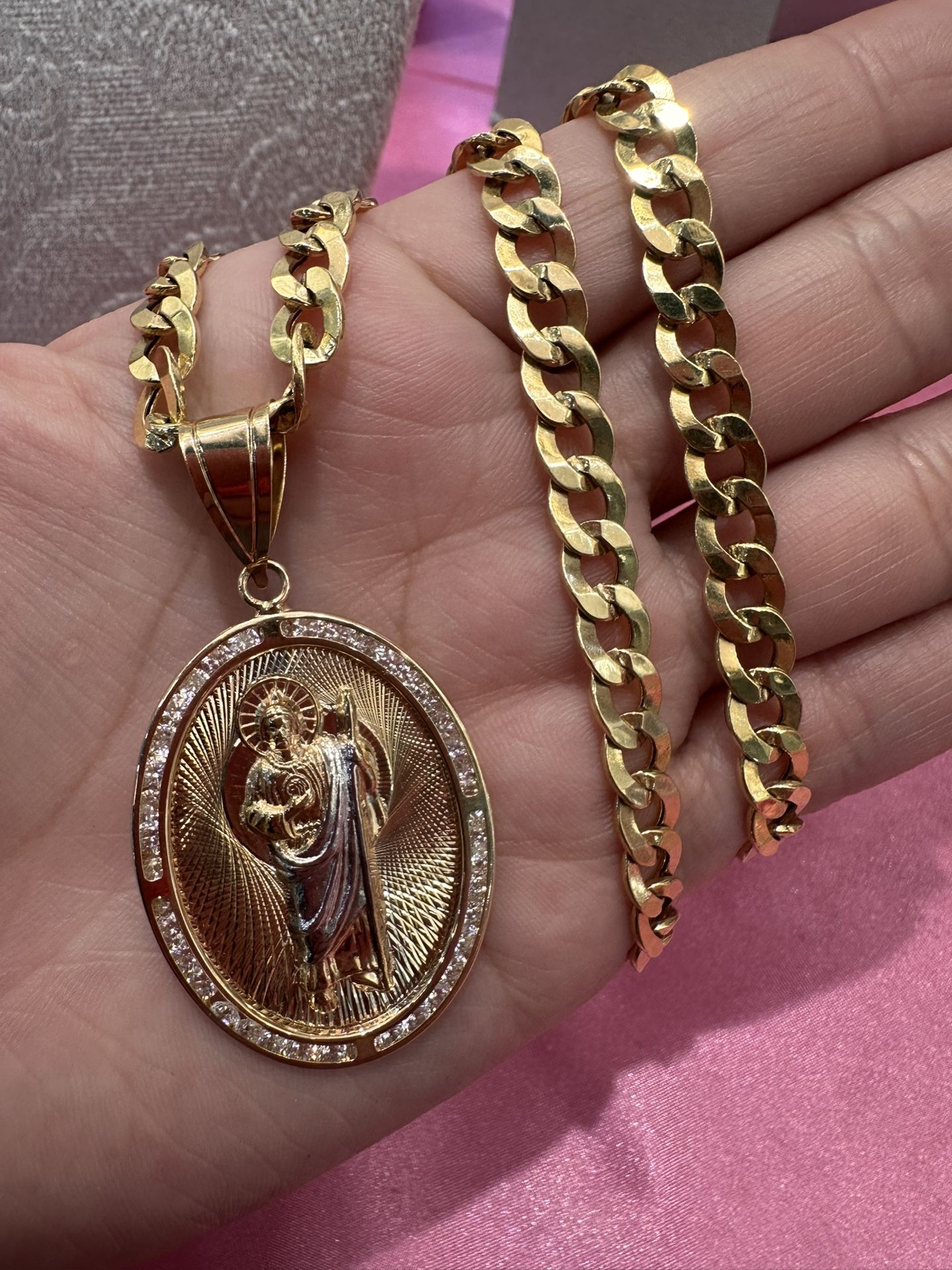 Authentic 14k Italian Gold ** THIS IS NOT GOLD PLATED** 26in 7mm Cuban Gold Chain Semi Hollow (lighter) 2 1/2in San Judas Pendant Cubic Zirconia **NEW** ‼️THIS ISNT SCRAP GOLD, NO SCRAP/MELT PRICE OFFERS WILL BE CONSIDERED‼️ PICK UP ONLY IN DOWNTOWN LA NO LOW BALLING- I will not reply NO TRADES