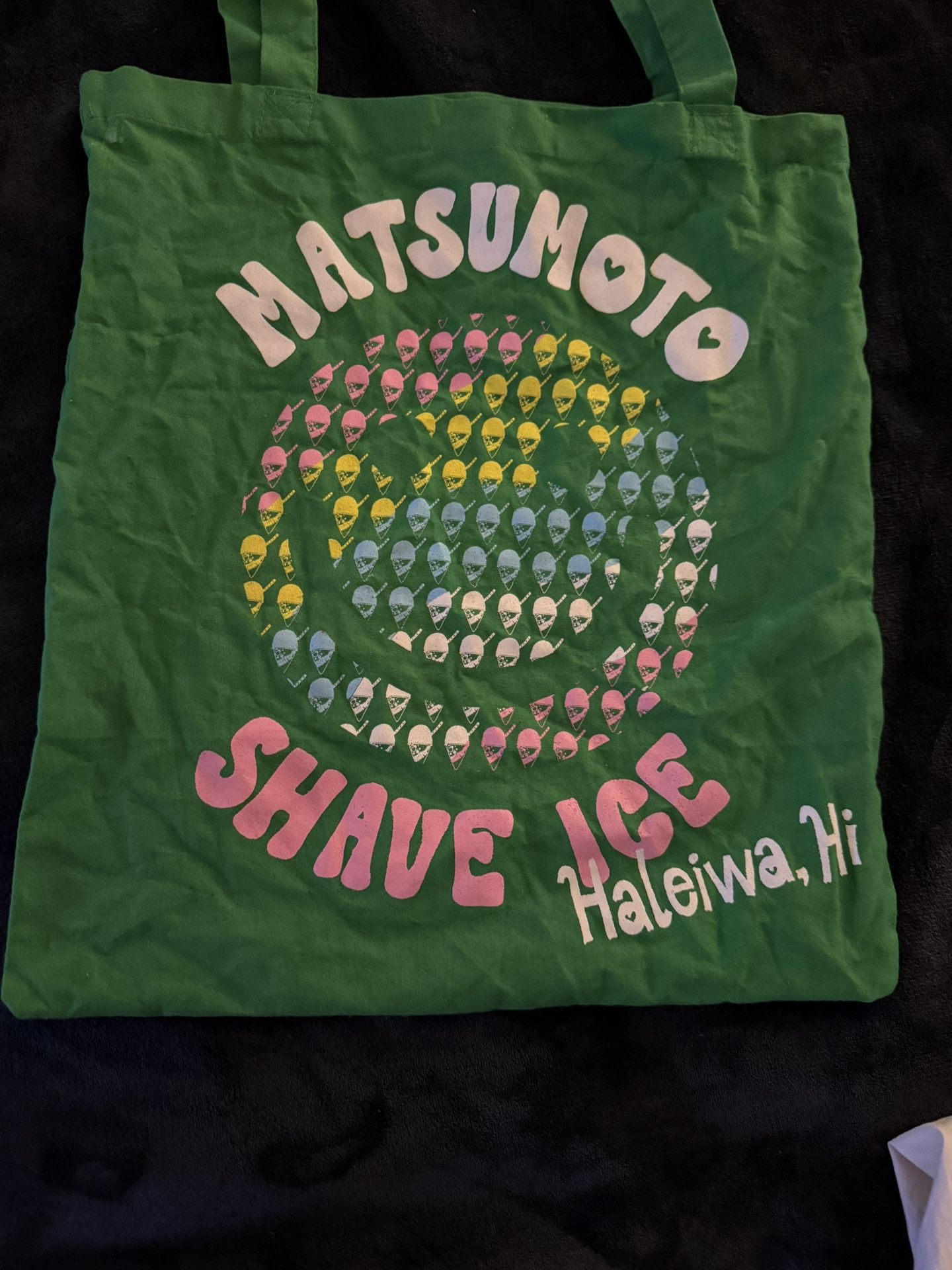This is a green cloth tote bag from Matsumoto Shave Ice Haleiwa, HI on the North Shore of Oahu. The design is a rainbow colored happy face made of tiny shave ice images. This bag was purchased over 20 years ago. Matsumoto is an island establishment-a favorite of locals and visitors alike for over 70 years. Celebrate Aloha every day with this cheery logo bag from Matsumoto The bag was purchased over 20 years ago at Matsumoto Shave Ice in Haleiwa, HI on the North Shore of Oahu