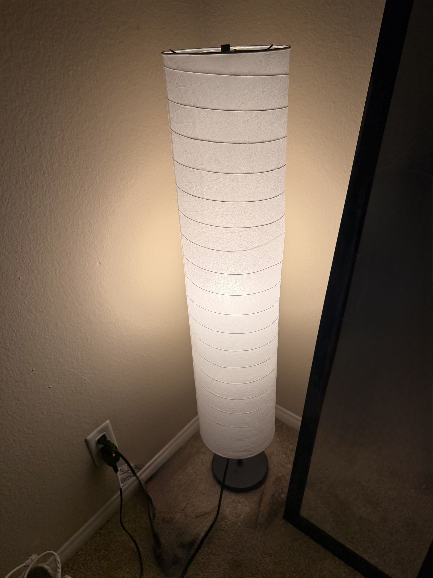 White floor lamp with warm yellow lighting. Good working condition. Perfect for bedroom or living room. Moving sale — only $10.