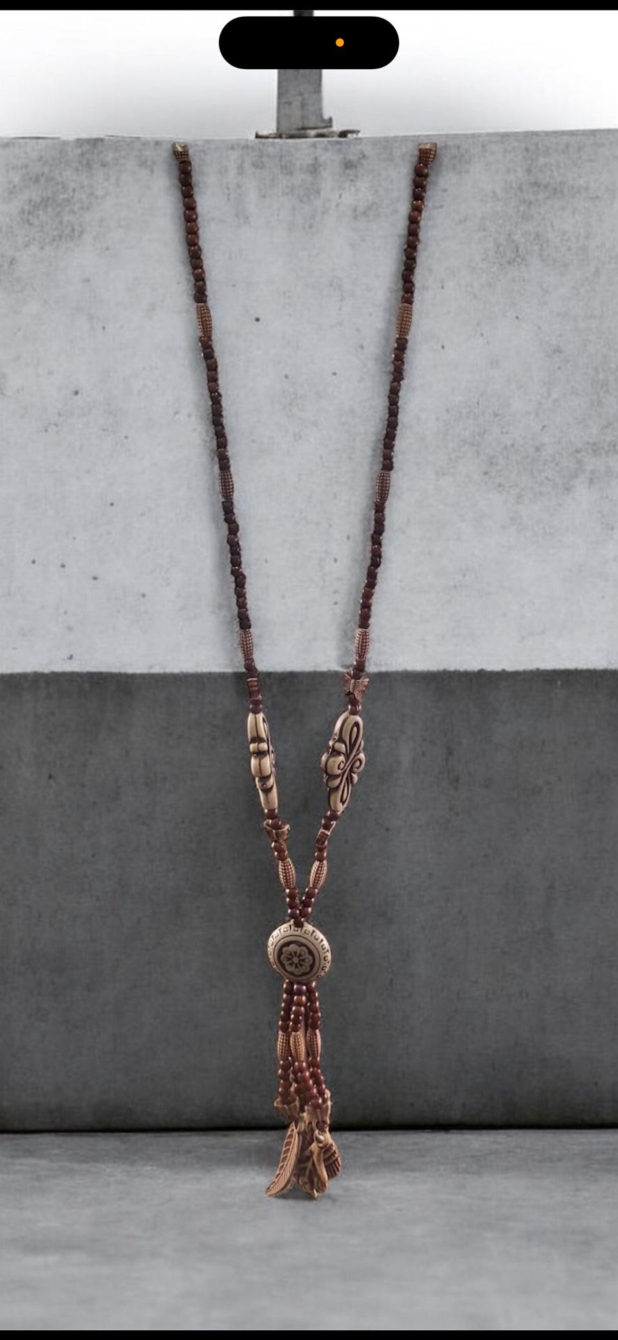 Beautiful bohemian-inspired statement necklace featuring rich earth-tone beads, mixed metal accents, and an eye-catching long drop pendant. The design includes decorative charms such as leaves, shell detailing, and a hand motif, giving it a relaxed southwestern / festival vibe. Lightweight and comfortable to wear, this necklace looks great layered over sweaters, dresses, or simple tops and adds instant character to any outfit. Perfect for casual everyday wear, festivals, travel, or gifting to someone who loves boho style jewelry. Long beaded necklace with statement drop Earth-tone beads with antique-style metal charms Lightweight fashion jewelry Boho / southwestern aesthetic Excellent condition A unique, stylish piece that stands out while still being easy to wear.