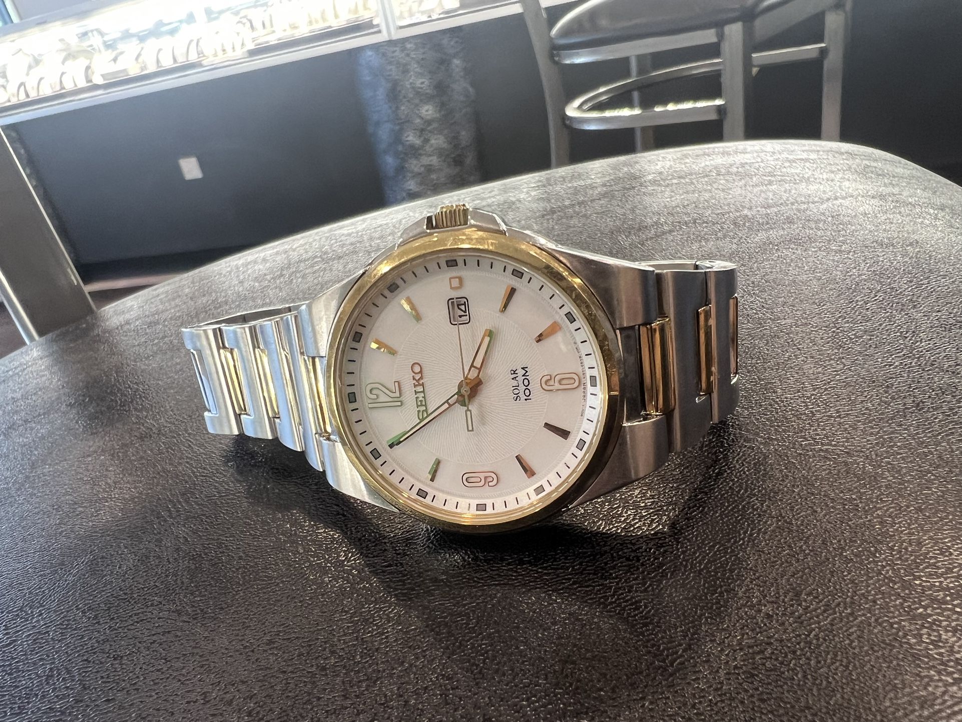 Movement Precisionist Quartz Analog Water resistant -30 meters Day/Date indicator Multiple hands Stick indices with some hour markers Band Width: 20mm Band Color: silver/gold Band Material: Stainless Steel Band Length: 9” Case Size: 44mm Crystal: Sapphire Dial: White with Lumi Brite Hands New watch battery. Polished and cleaned.