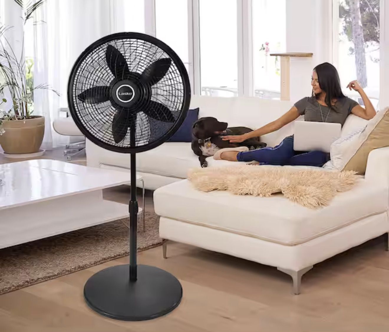 Brand new in its own open box not used Lasko Cyclone 18 in. 3 Speed Oscillating Pedestal Fan for Home in Black with Adjustable Height, Tilt Back Head, Easy Assembly Easy-to-use manual controls 3 refreshing speeds Widespread oscillation for full room coverage Fully adjustable height and tilt-back fan head for customized airflow Features an 18-inch, 5-paddle fan blade Easily portable Ideal for larger room in the home Simple no-tool assembly Features Lasko's Blue Plug trusted safety fuse technology, the plug is designed to cut off electric current to the fan if it detects a potentially hazardous electrical fault in the fan's motor or power supply.