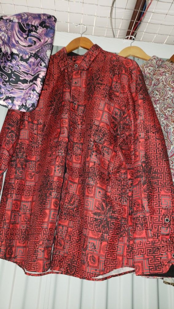 Color/Pattern: Vibrant red with black Greek-key and floral overlay pattern Material: Smooth, lightweight fabric with a slight sheen Condition: Excellent ā clean, crisp, and ready to wear Style: Perfect for performers, nightlife, or anyone who wants a confident, bold look Pairs beautifully with black or gold blazers and dress pants ā an instant attention-getter for stage or evening wear. š° Price: $35 (open to reasonable offers) š Near downtown Clearwater š Message me to arrange pickup or bundle with other luxury shirts and blazers for a discount