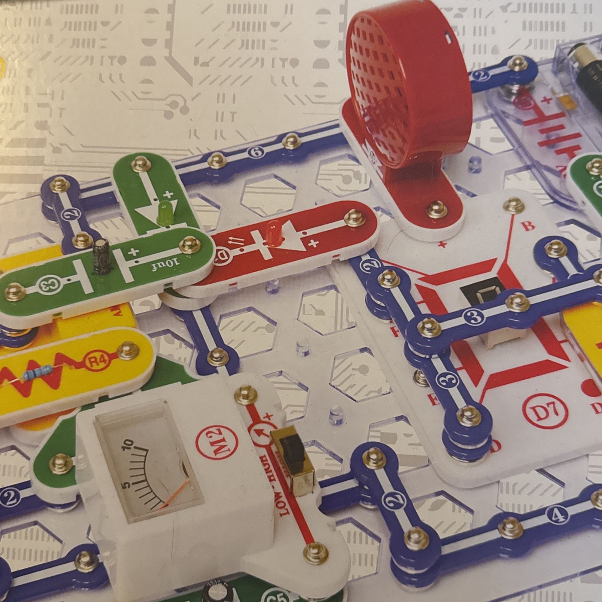 Snap Circuits features building components with snaps to assemble electronic circuits that function like the printed circuit board found in most electronic products. All parts are mounted on plastic modules and snap together with ease.