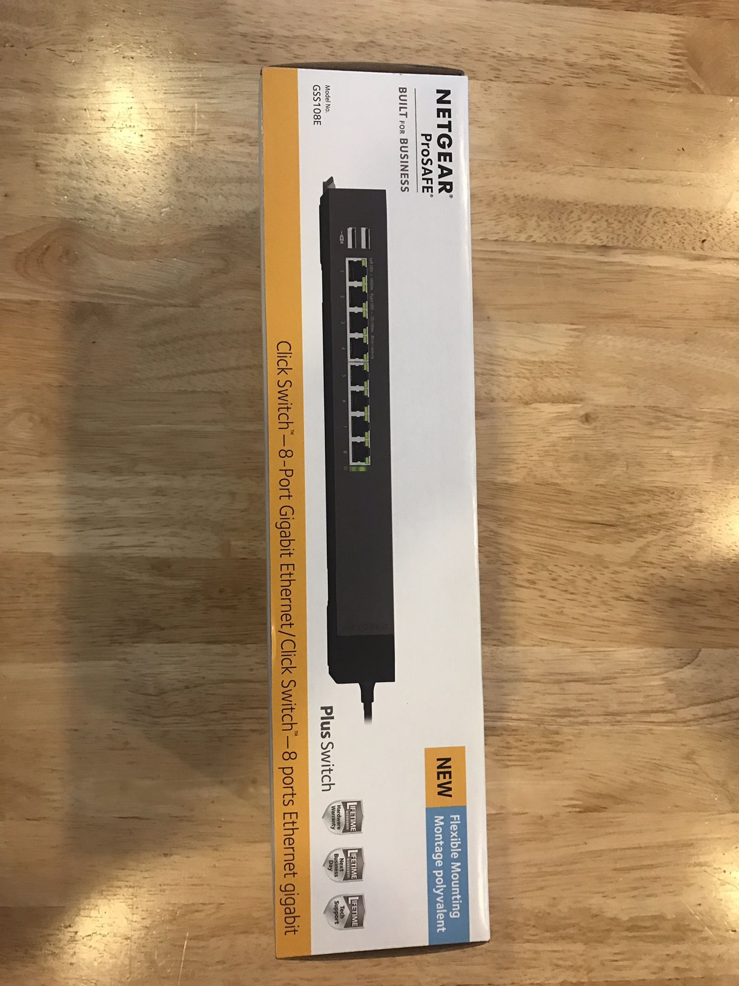 GSS108E 8 port gigabit lan Managed switch (software or web browser) Great small switch with multiple mounting options. Also has USB ports to charge phones/devices. I upgraded to 16 port POE switch and no longer have a use for this.