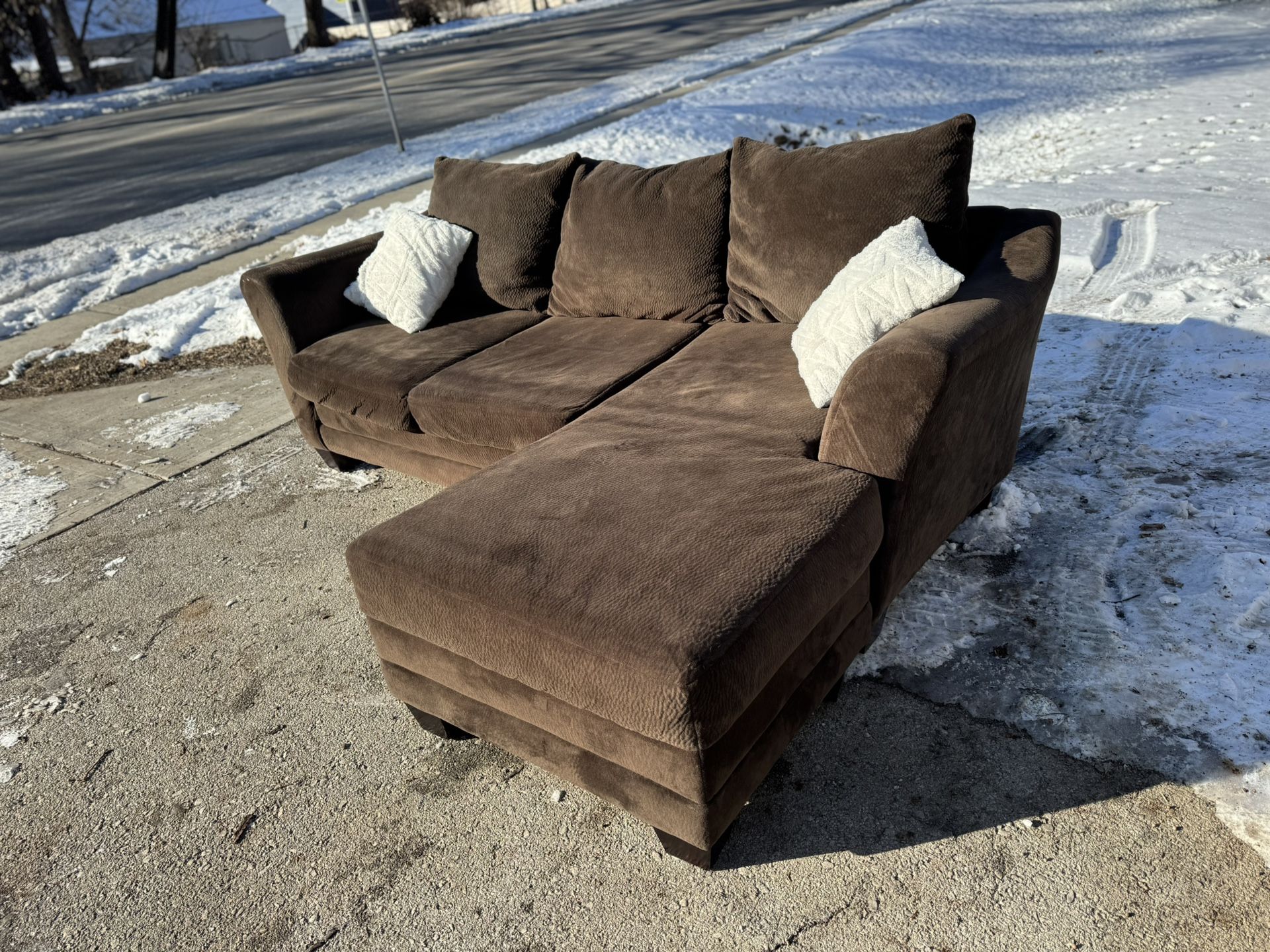 Brown suede L shape with reversible chaise Has been shampooed and steam cleaned, can fit up to 3 people. Super comfortable & ready for a new home. Delivery options Kc metro area (within reason) $80 Outside Kc metro area (within reason) $100 Can bring inside your home or garage for $20 Measurements L 87 W 38 Chaise L 64