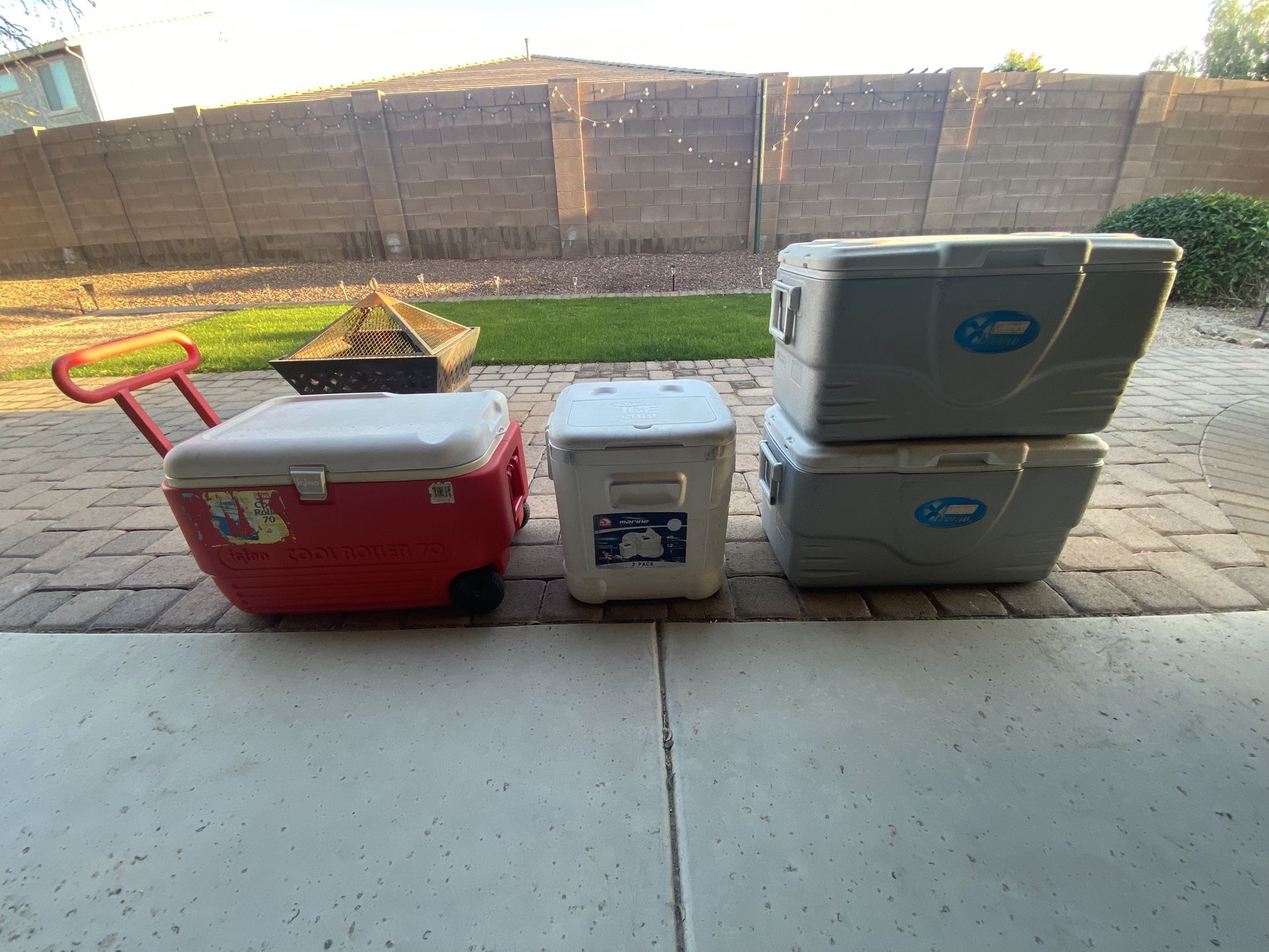 Red Igloo cooler with wheels -70 qt =$25 #1Coleman Xtreme - 52 qt - $15 White Igloo (square) - 48 qt = $15 #2 Coleman Xtreme - 52 qt - $15 Individually priced as listed above. Buy all 4 for $45 total