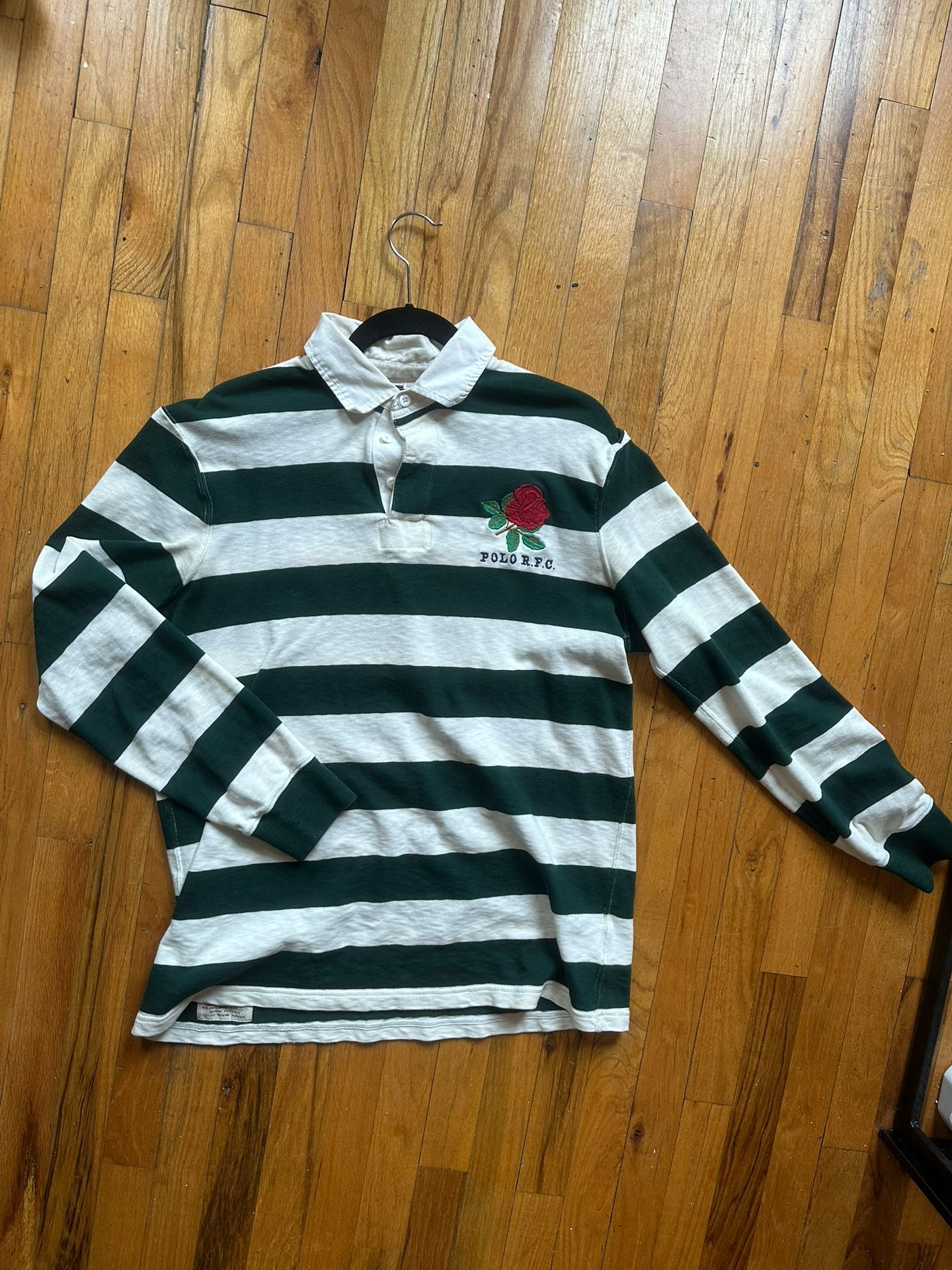 Ralph Lauren Men's Classic Fit (Green/White) Striped Rugby Shirt, Size Medium Very Gently Used.