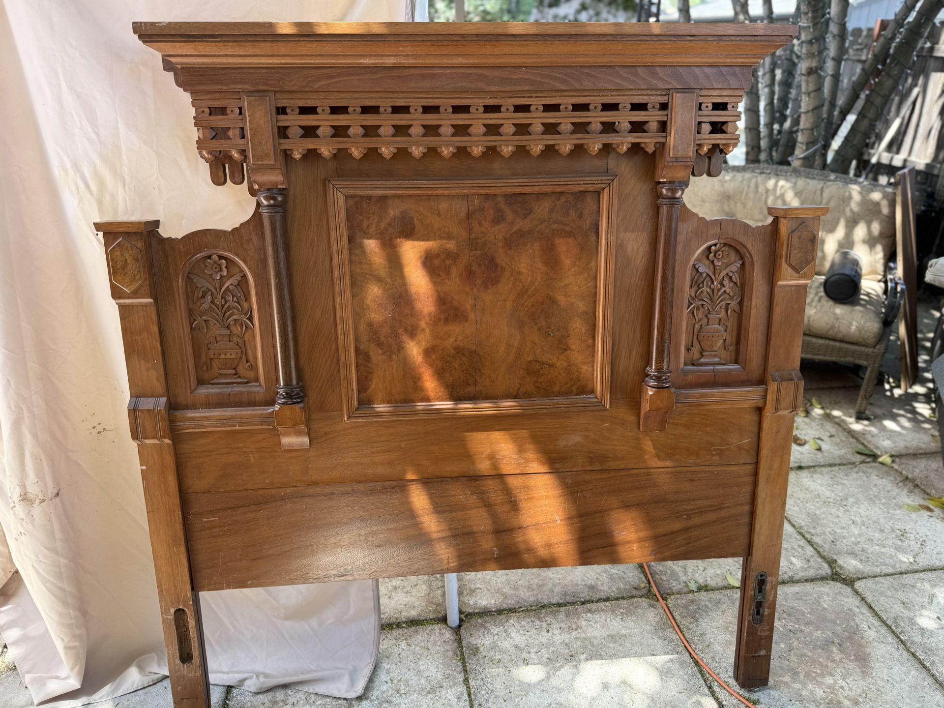 Gorgeous vintage full-size bed frame with ornate Victorian-style carvings, burled wood panel inlays, and beautiful moldings. Includes headboard, footboard, and original wood rails. Solid structure with light wear from age.