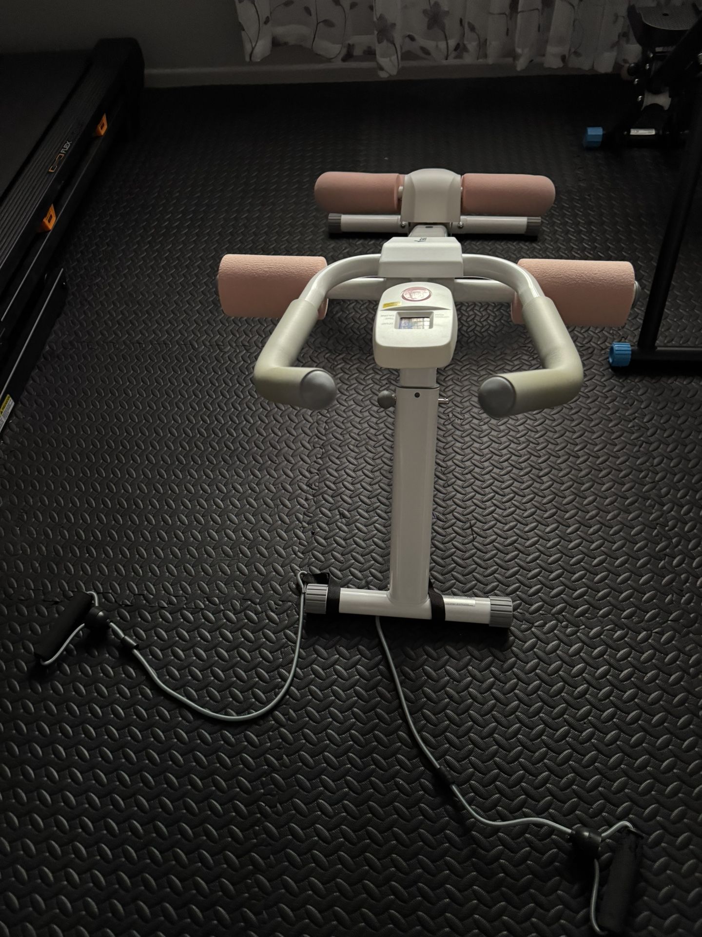 It is a new item put together. It is sold on tic toc. Adjustable height for harder resistance. Comes with two hand bands to work the arms as well.