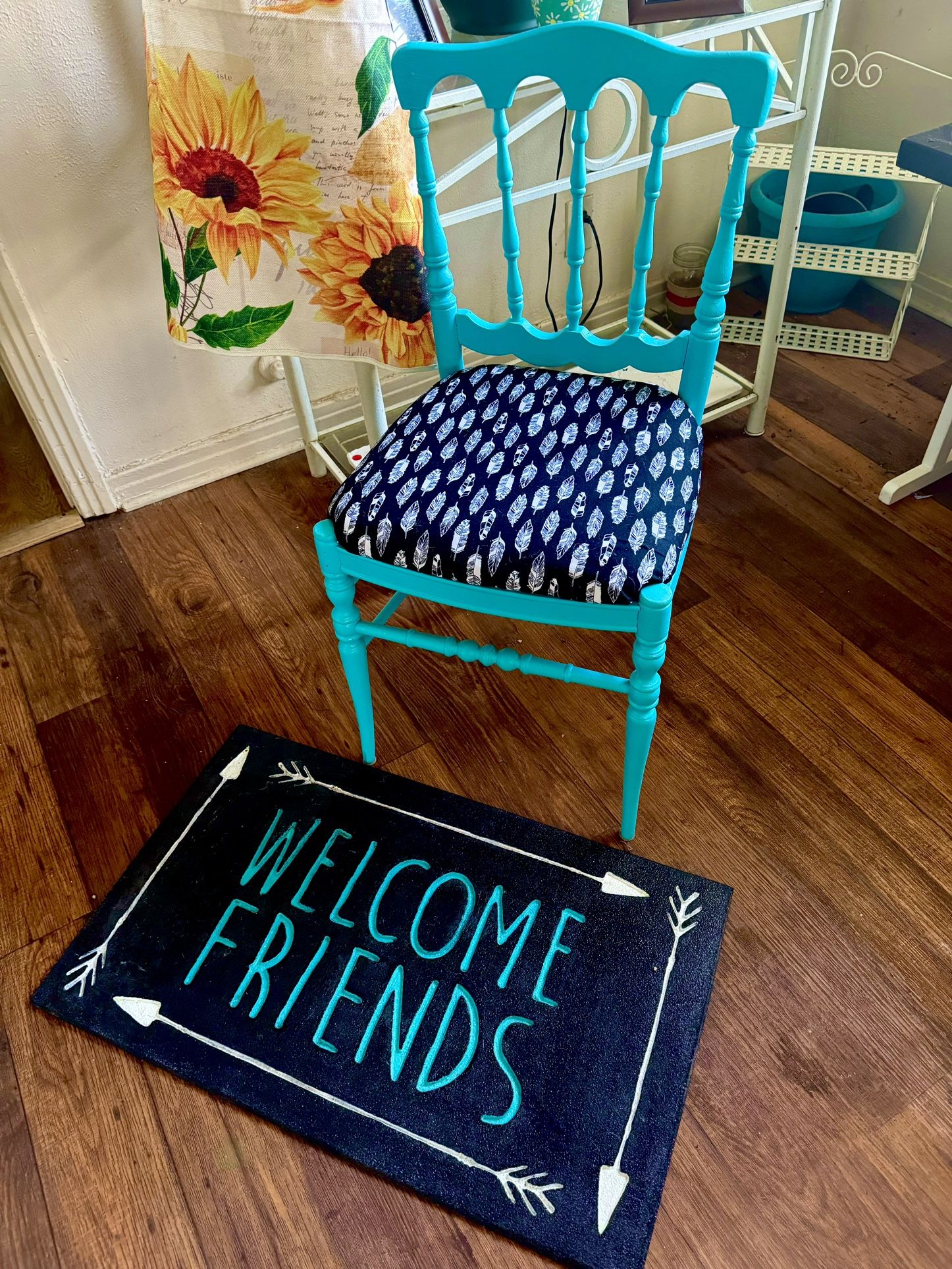 Vintage Farm House/BOHO Chair And Custom Painted welcome mat. All custom redone chair, sanded, repainted, re apolstered. Welcome mat hand painted to match. 150$ or best offer! More to come!