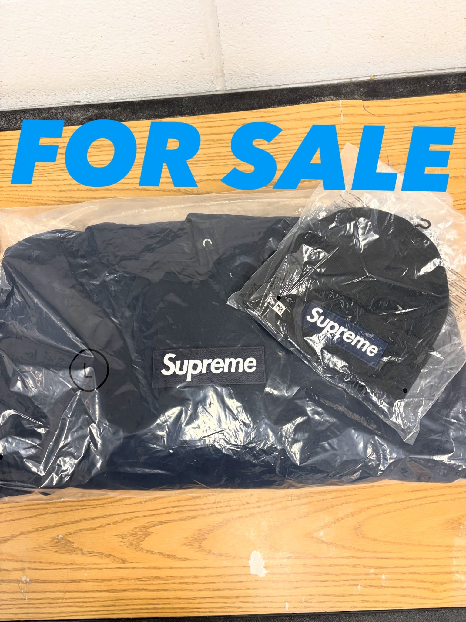 Selling a brand new in package 2025 Supreme box logo hoodie with matching beanie Size: large Color: Navy blue Asking: Sweater: 275$ Beanie: 75$ Willing to deliver