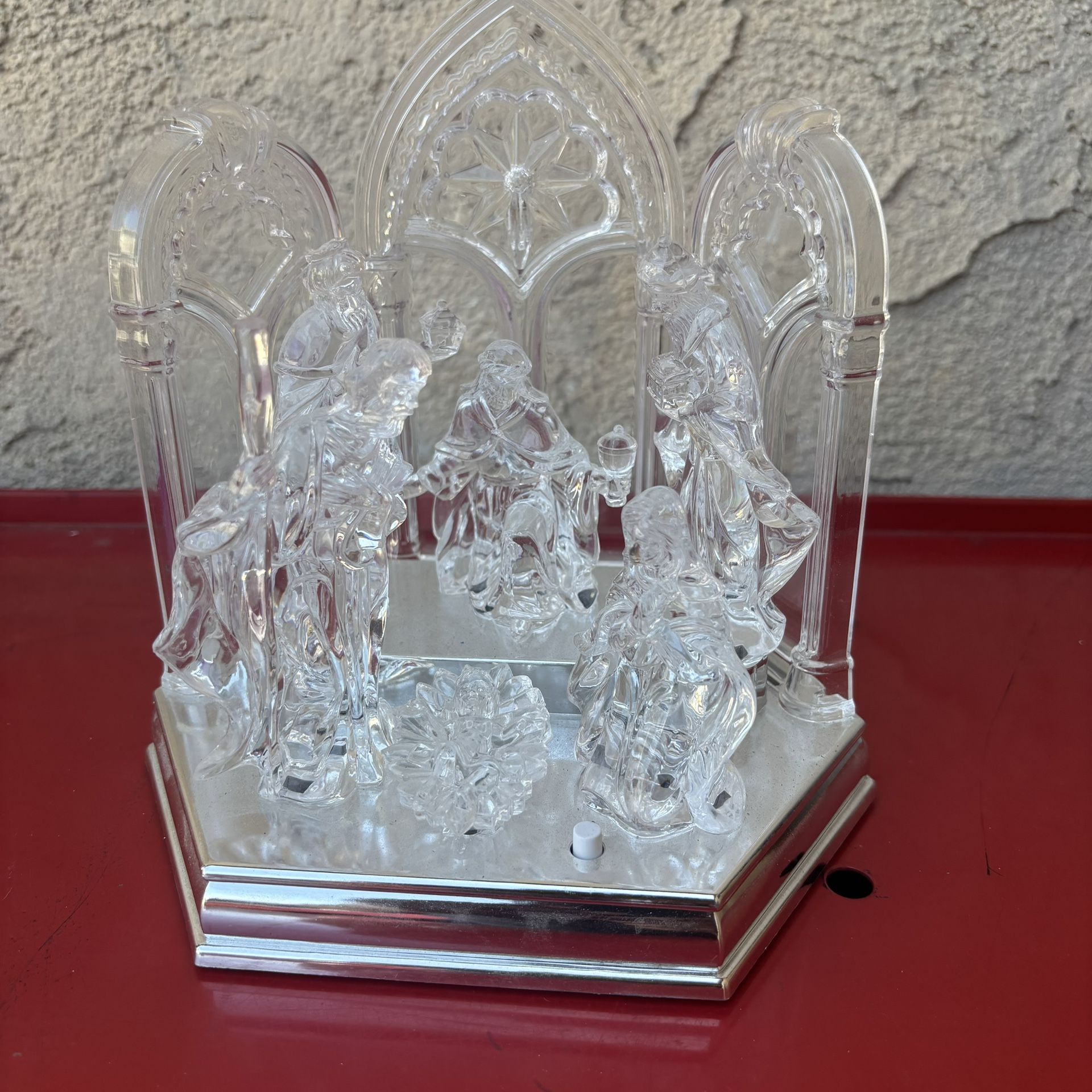 Beautiful light-up nativity scene featuring clear acrylic figures with a church-style backdrop. Lights up and plays music (battery operated). Detailed nativity set (Mary, Joseph, baby Jesus, wise men) Clear acrylic/glass-like design Built-in lights + music feature Battery powered with on/off switch Great Christmas decoration or gift