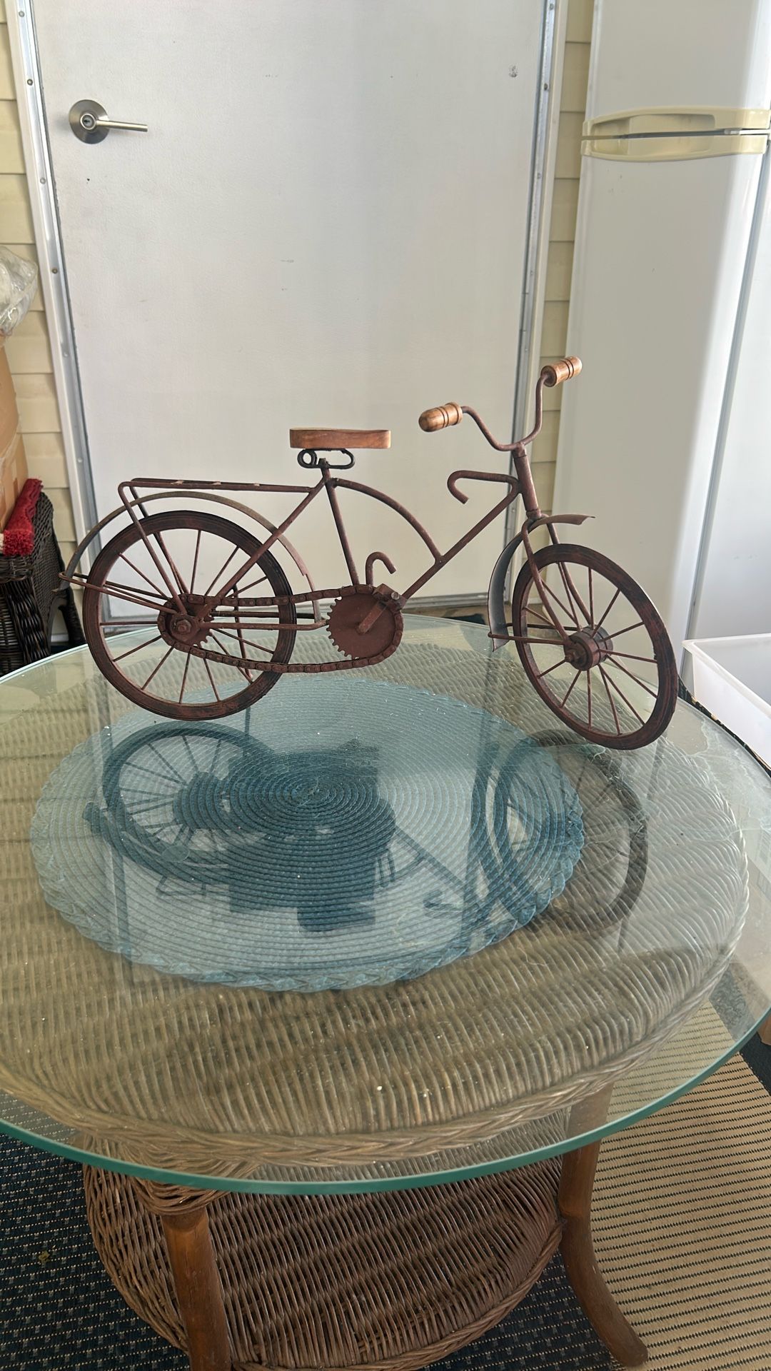 Vintage metal bike sculpture" or "miniature working bicycle replica". this sculpture features a working sprocket and chain, allowing the pedals to turn the wheels. The body is primarily metal, while the seat and handlebar grips are made from stained Dimensions 18 to 21 inches long and about 10 to 12 inches