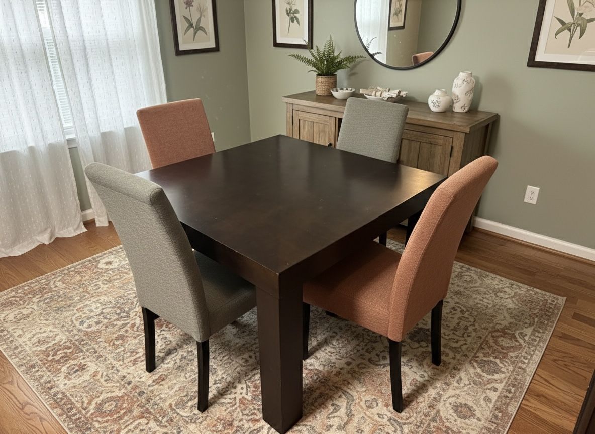 Square dining table with 4 chairs, perfect for smaller spaces. The chairs are upholstered in a unique olive green and carrot orange fabric combo. The table and chairs have some minor scuffs from previous moves, adding a touch of character. 42 in x 42 in , 30 in height $185