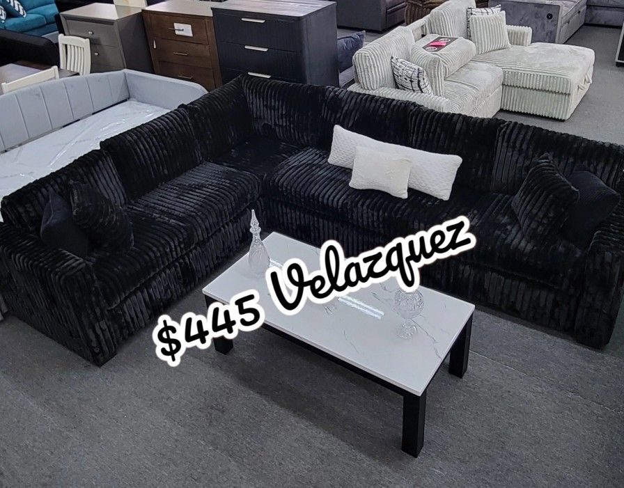 ✅️✅️4 pc black corduroy fabric upholstered 119" sectional sofa. This set includes the LAF / RAF love seat, corner wedge and armless chair. Sectional measures 119" x 92" x 33" x 34" H. This set is KD , Ready to assemble. Requires assembly✅️✅️$445 + sale tax $490 total cash only,this promotion is just pick up only Delivery is not available ✅️✅️