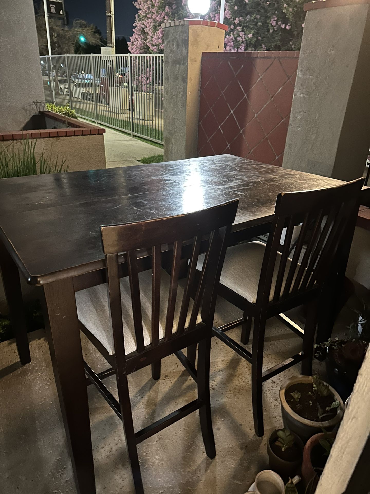 8 seat dining table that used to be able to extend but we broke the latch. Other than that it’s in good condition and can be refurbished. Take all 8 seats and dining table for $200