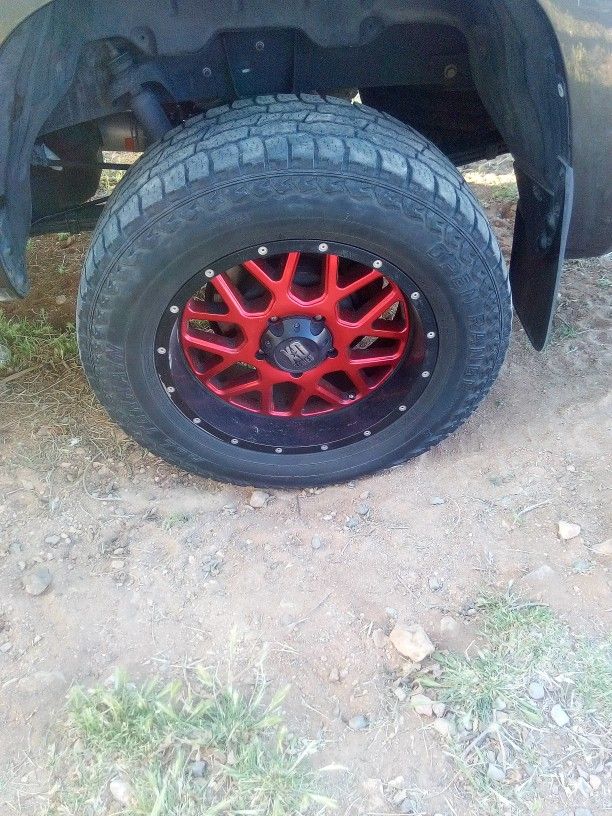 5 lug XO series rims 20 inch red anodized fits all tundras lt275x65r20s 126x 123s all terrain open range tires have all four