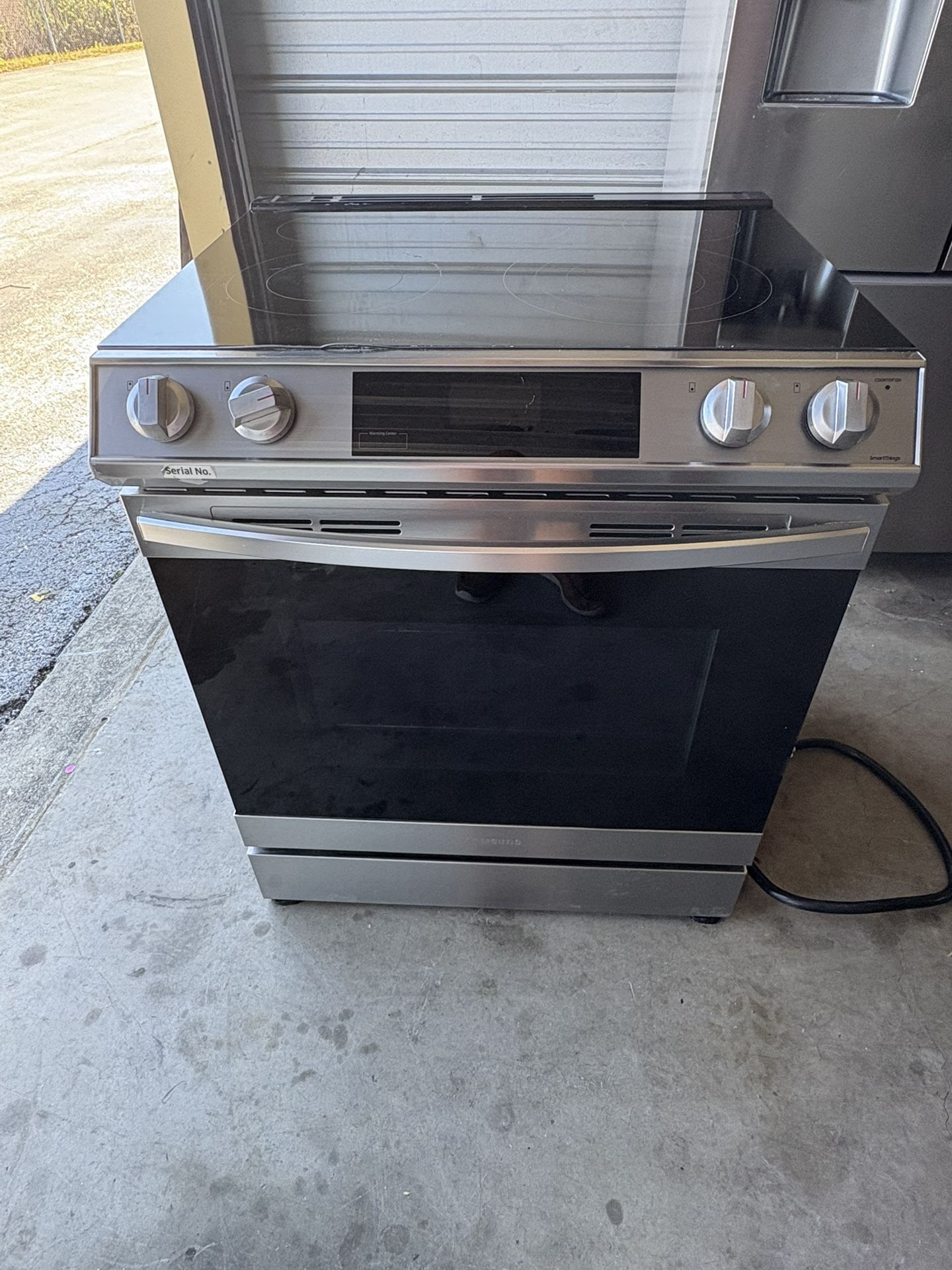 Stainless Steel Samsung Slide in electric glasstop stove in very good condition. Two small single burners, one medium dual burner, one large triple burner plus warming zone. Oven is convection. It comes with 4-prong power cord.