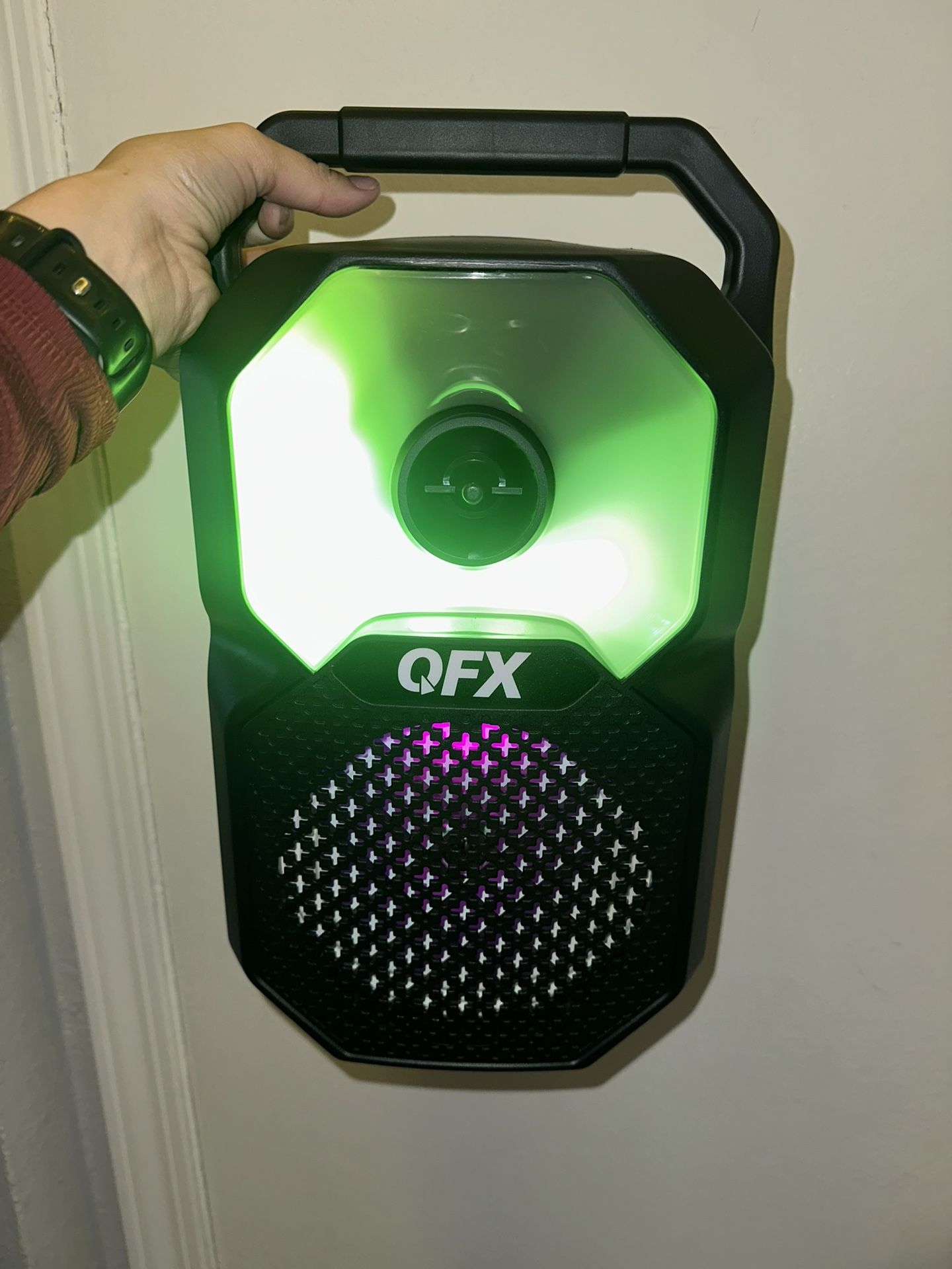 QFX Bluetooth speaker Microphone connection Aux usb LED PARTY LIGHTS Rechargable Will provide connections Brand new 6.5”