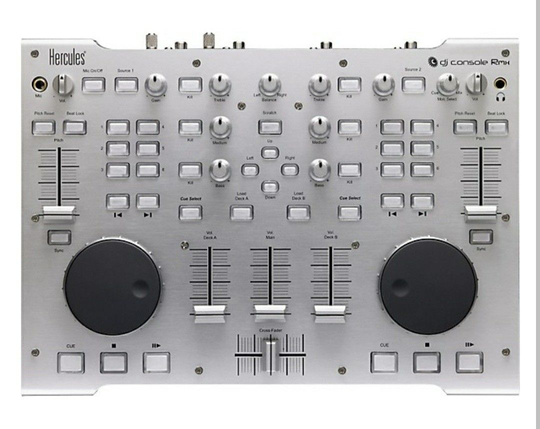 The Hercules DJ Console RMX is a premium DJ controller and audio interface which incorporates a range of rotary, button and fader controls for controlling your selected DJ software or the included Virtual DJ 5 software. Also with 2 touch sensitive platters, LED backlit buttons, dual headphone connectivity and versatile in/out connections the Hercules DJ Console RMX is an excellent choice for both aspiring and experienced DJ’s alike. Hercules DJ Console RMX specifications Below you will find the product specifications and the manual specifications of the Hercules DJ Console RMX. The Hercules DJ Console RMX is a dj gear that offers a range of features for DJs. It is equipped with 4 channels, allowing users to mix and transition between tracks seamlessly. With 2 line inputs (RCA), DJs are able to connect external audio sources to enhance their mixes. Additionally, the product includes 1 USB 2.0 port for convenient connectivity to compatible devices. The Hercules DJ Console RMX provides 2 master (L, R) outputs, enabling DJs to connect their gear to external speakers or audio systems for a powerful and immersive sound experience. The product is compatible with various Windows operating systems, including Windows 7 Home Premium, Windows 7 Professional, and Windows Vista Ultimate, among others. It is also supported by Mac OS X 10.5 Leopard and Mac OS X 10.6 Snow Leopard. To ensure smooth performance, the Hercules DJ Console RMX requires a minimum processor speed of 1.5GHz and at least 1024 MB of RAM. These specifications enable DJs to mix and manipulate audio tracks with ease and precision. Overall, the Hercules DJ Console RMX offers a reliable and versatile platform for DJs to showcase their skills. Its multiple channels, line inputs, and master outputs provide the necessary tools for seamless mixing and audio manipulation. Compatible with both Windows and Mac operating systems, it caters to a wide range of users. Whether for professional gigs or home use, this dj gear is designed to deliver high-quality performance and is constructed with durable materials for long-lasting reliability.