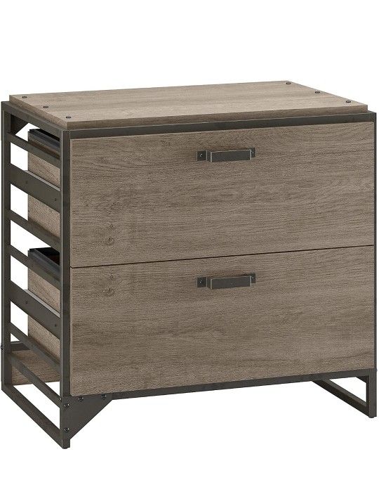 Organize your home office and express your rustic tastes with the Bush Furniture Refinery 2 Drawer Lateral File Cabinet. Featuring an open Industrial Steel frame along with matching hardware and exposed bolts, this lateral filing cabinet combines a reclaimed feel with complete convenience. Your choice of distressed Cottage White, Restored Gray, Dark Gray Hickory or Rustic Gray with Charred Wood finish options complement the industrial design. Two full-extension file drawers open on smooth ball bearing slides for an effortless reach to letter, legal and A4-size paperwork. Perfect for the home office, loft or creative space, the 2 Drawer File Cabinet matches the height of coordinating Refinery Industrial Desks (sold separately) to extend your work surface. This Lateral File Cabinet has been tested to meet ANSI/SOHO quality standards for safety and performance and is backed by the Bush Furniture 1 Year Manufacturer's Warranty. View the full line of industrial furniture to find the perfect fit for your work or living space.