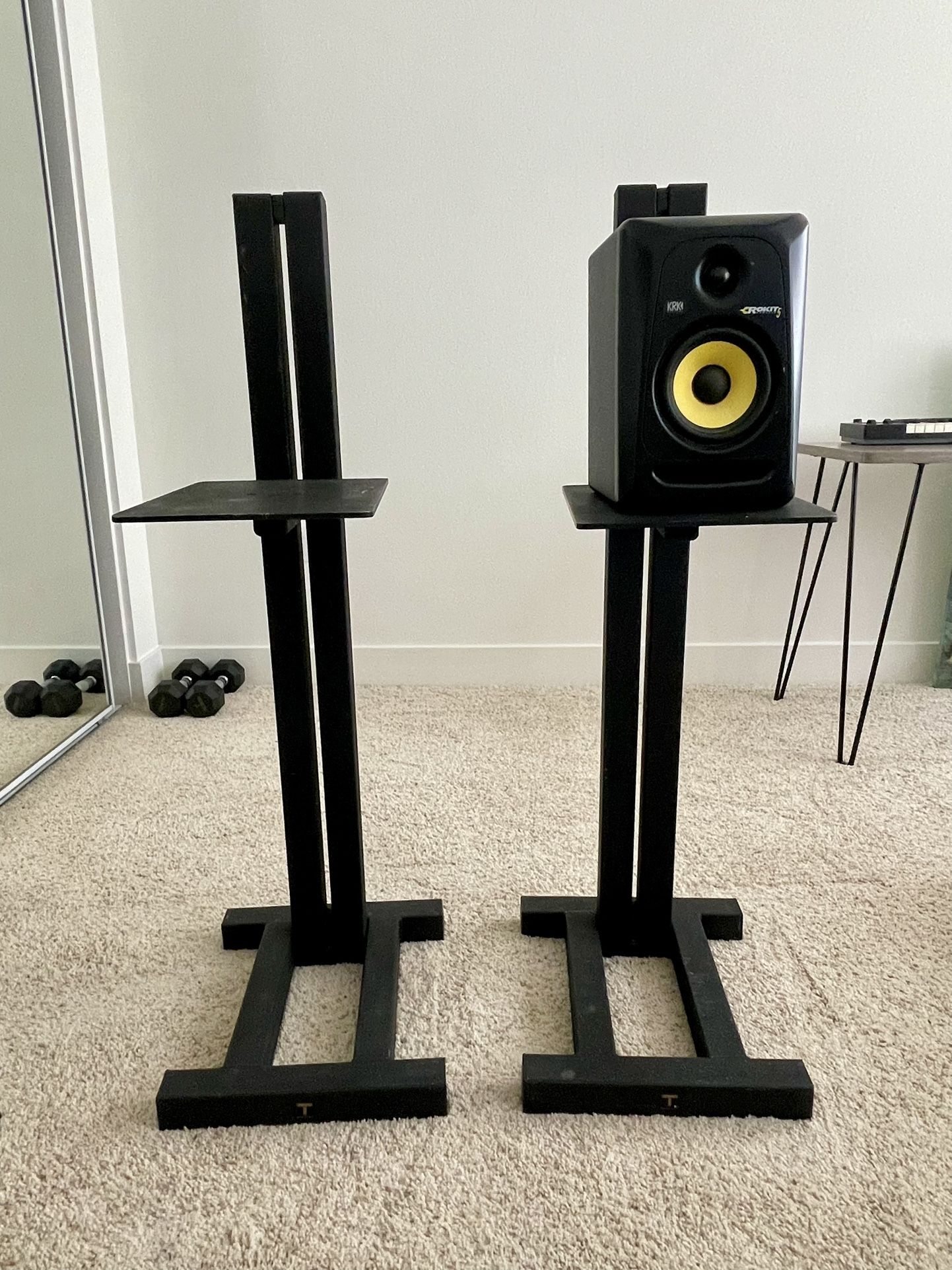 ADJ2 Monitor Stands from Sound Anchors are a fantastic solution for elevating your studio monitors and decluttering consoles and desktops. Thanks to ADJ2’s adjustable height and tilt angle, you’ll be able to configure your speakers so that they deliver the best sound for your space. Constructed of filled steel tubing and aluminum plating, these welded stands are extra-sturdy, boasting 17-inch x 23-inch spiked bases that not only help with stability, but aid in coupling and decoupling your speakers, too. The aluminum speaker platforms measure 12 inches x 16 inches and include special sorbothane insulation pads for eliminating rattle and preserving your monitors’ best sound. ADJ2 works best for speakers with a width no wider than 24 inches and a depth no greater than 18 inches, and smaller speakers will sit comfortably as well. These versatile stands can be enlisted for a variety of atmospheres and uses, including music studios, radio and TV studios, surround-sound monitoring, CD mastering, film post-production, video game production, and more. All Sound Anchors stands are hand built in the USA and are regularly used in professional studios worldwide.