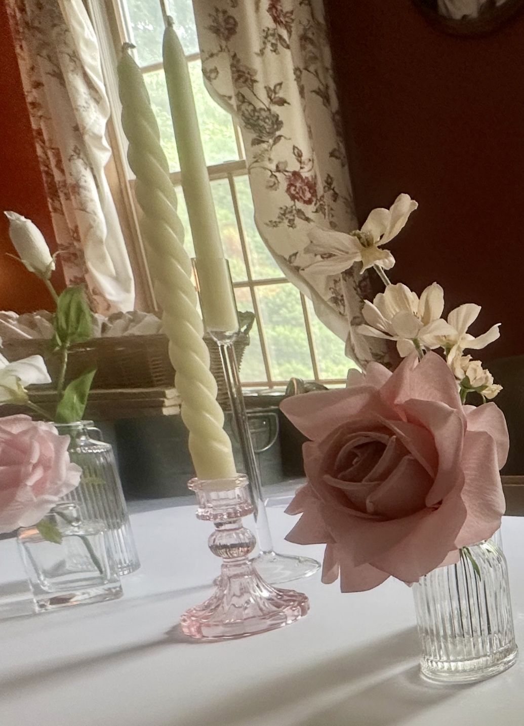 CENTERPIECE DECOR Description: Assorted centerpiece decor. Perfect for a garden party or wedding/baby shower. Condition: New (only used for 1 event) Centerpiece Decor Includes: • 22 Bud vases with real-touch faux flowers • Flower colors: shades of pink, blush, white • Flower types: garden roses, assorted wildflowers • 4 Clear candlestick holders • 6 Pink candlestick holders • 4 Ivory candlesticks • 6 Ivory spiral candlesticks