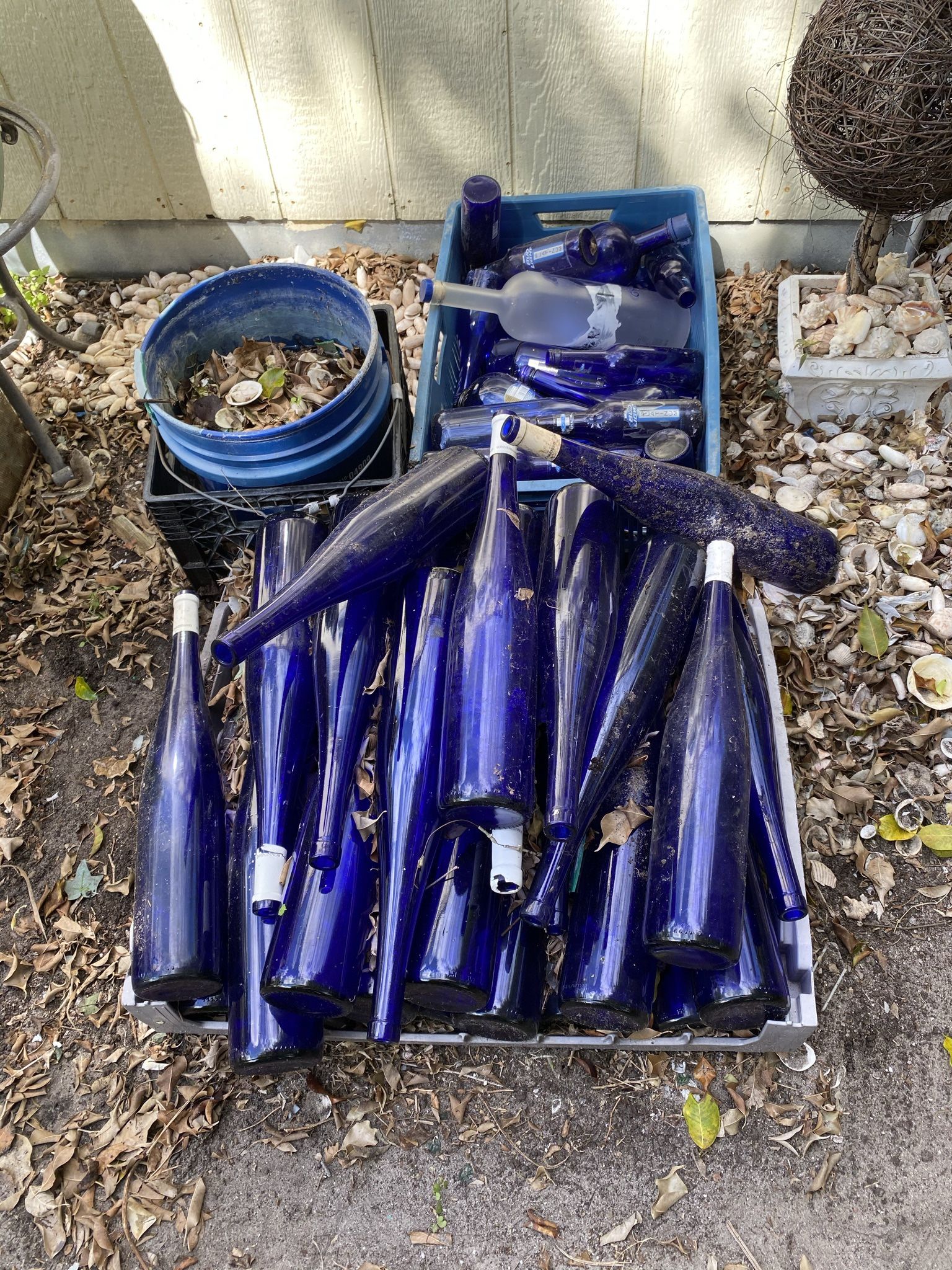 A large collection of glass blue bottles used for lawn decoration or whatever the whole thing for free. FREE