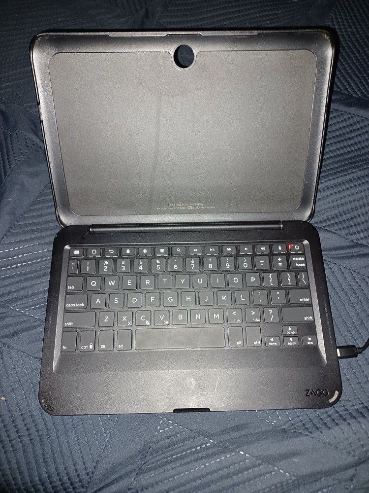 Found in auctioned storage unit First picture shows red light for charging, 2nd picture I turn it on and shows green 3rd picture is the product Info I guess you connect your tablet or iPad to this so you can use the keyboard. It does have a hole up top of back side for a camera opening make sure your tablet iPad camera is in same spot
