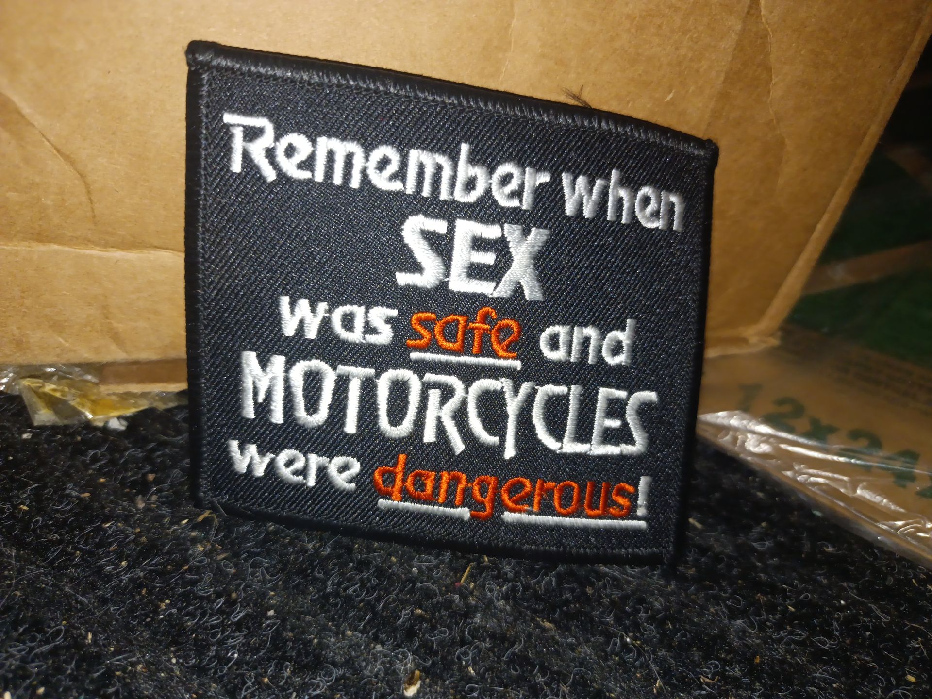 Up for sale is a motorcycle patch that says remember when sex was safe and motorcycles were dangerous