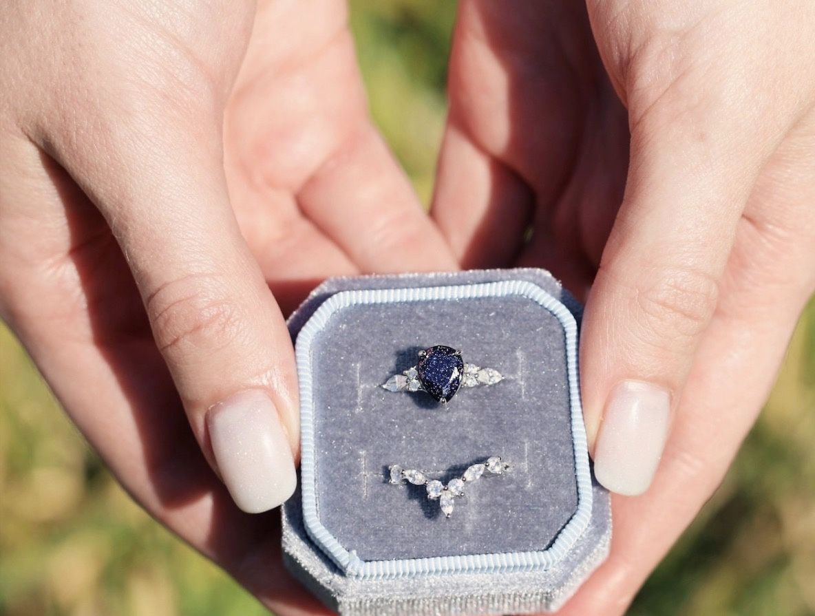 This is a truly rare and beautiful two-piece engagement ring—one of those pieces you instantly know is special. The deep, midnight-blue center stone is rich and captivating, perfectly set among brilliant accent stones on a sculpted white-metal band. It’s elegant, timeless, and unmistakably unique. Valued at $6,000, we’re offering it for $3,500. A remarkable ring for someone who appreciates true beauty and rarity.