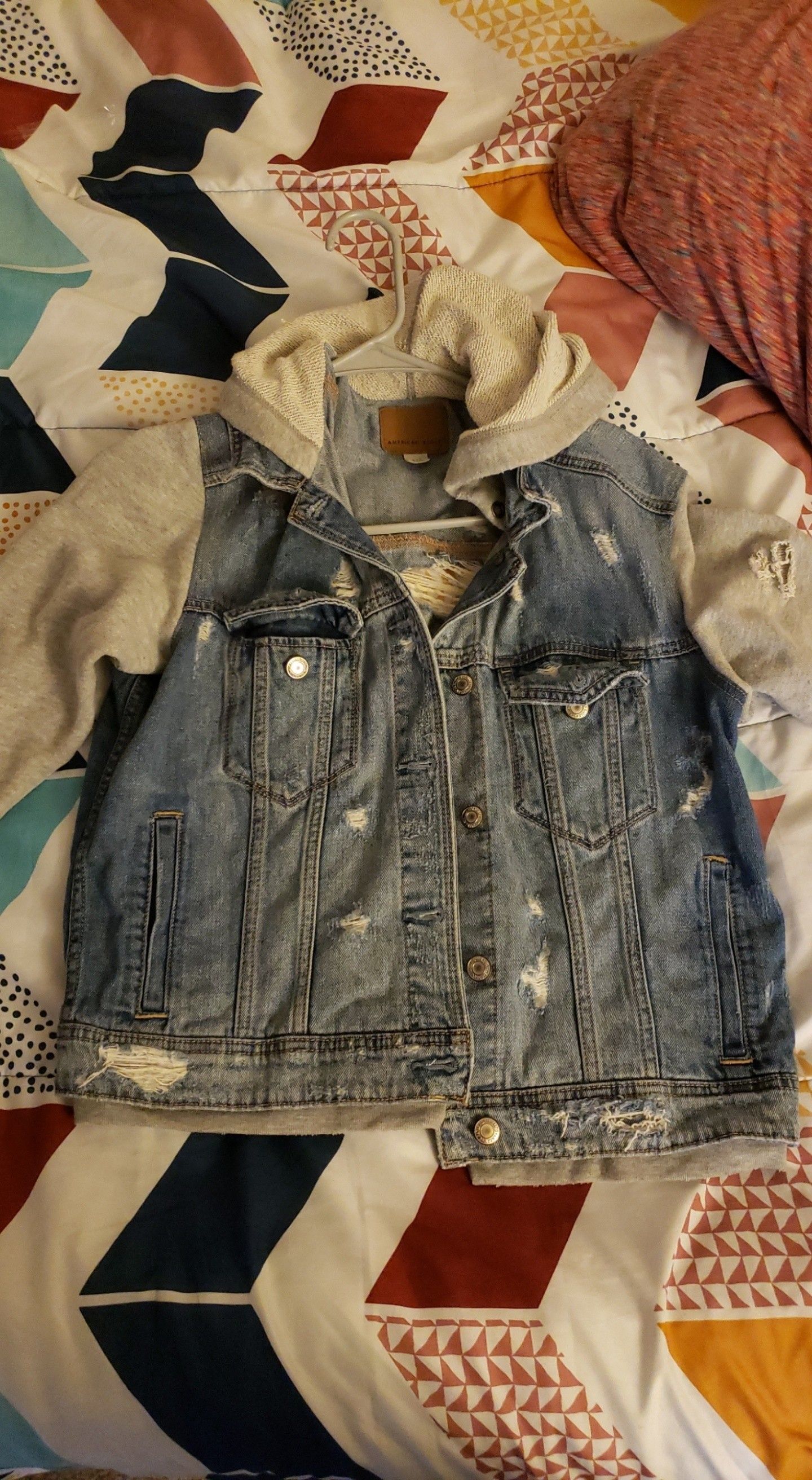 Fairly new jean jacket with hood . No stains freshly washed . Paid 90 from American eagle