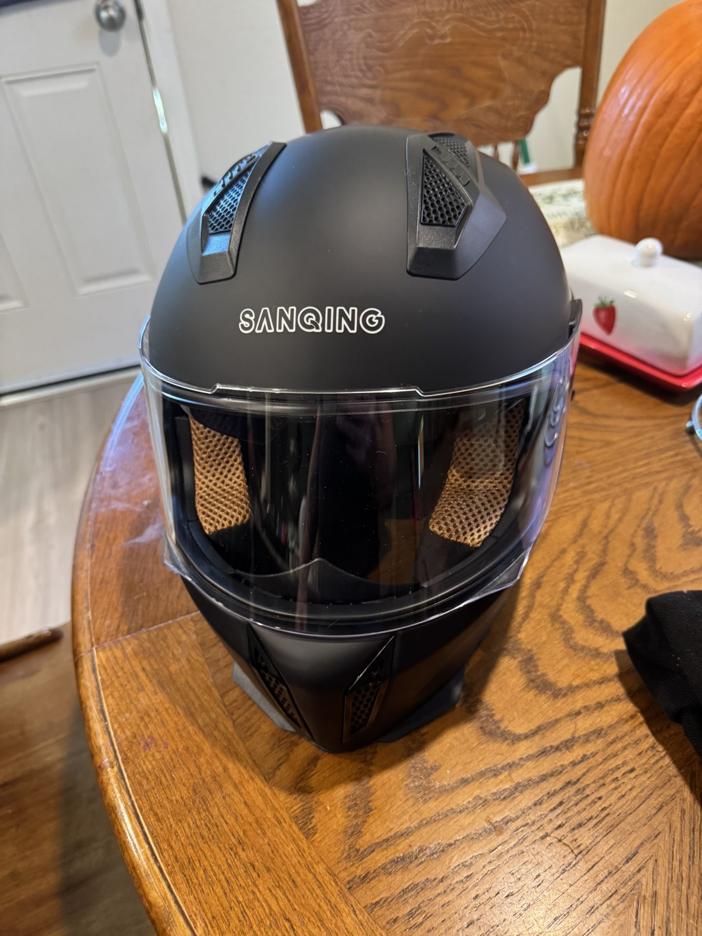 Brand new large mens motorcycle helmet can be used to ride dirt bikes, or four wheelers never been worn has a little bag with it to keep it safe and not get scratched