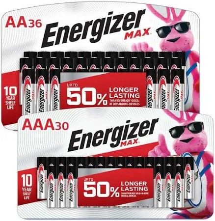 Power the devices you love with this Energizer MAX Alkaline AA and AAA Battery Combo Pack. These Energizer batteries fuel the technology that helps you live, work and play, whether you need remote batteries, clock batteries or backup batteries for your child's favorite toys and games. Energizer's #1 longest-lasting MAX, these double AA and triple AAA batteries keep your favorite devices running longer. Powerseal Technology helps protect your devices against damaging leaks for up to 2-years after these AA and AAA Energizer MAX Batteries are fully used. with a shelf life of up to 10-years in storage, these long-lasting batteries are ready to keep your devices operating when you need them most. Depend on the power of Energizer MAX double A and triple A Batteries to power your everyday electronics. -66-count of Energizer MAX alkaline double AA batteries (36-pack) and triple AAA batteries (30-pack) -Energizer's #1 longest-lasting MAX AA and AAA batteries provide dependable power - up to 50% longer lasting than EVEREADY Gold in demanding devices -Power you depend on for your AA and AAA devices, from toys and flashlights to everyday items like remotes -Energizer AA and AAA batteries hold power for up to 10-years in storage -Energizer MAX AA and AAA batteries are designed to protect your devices against damaging leaks for up to 2-years after fully used -Feel confident knowing you have the long-lasting power and protection you expect from Energizer with this AA and AAA battery pack