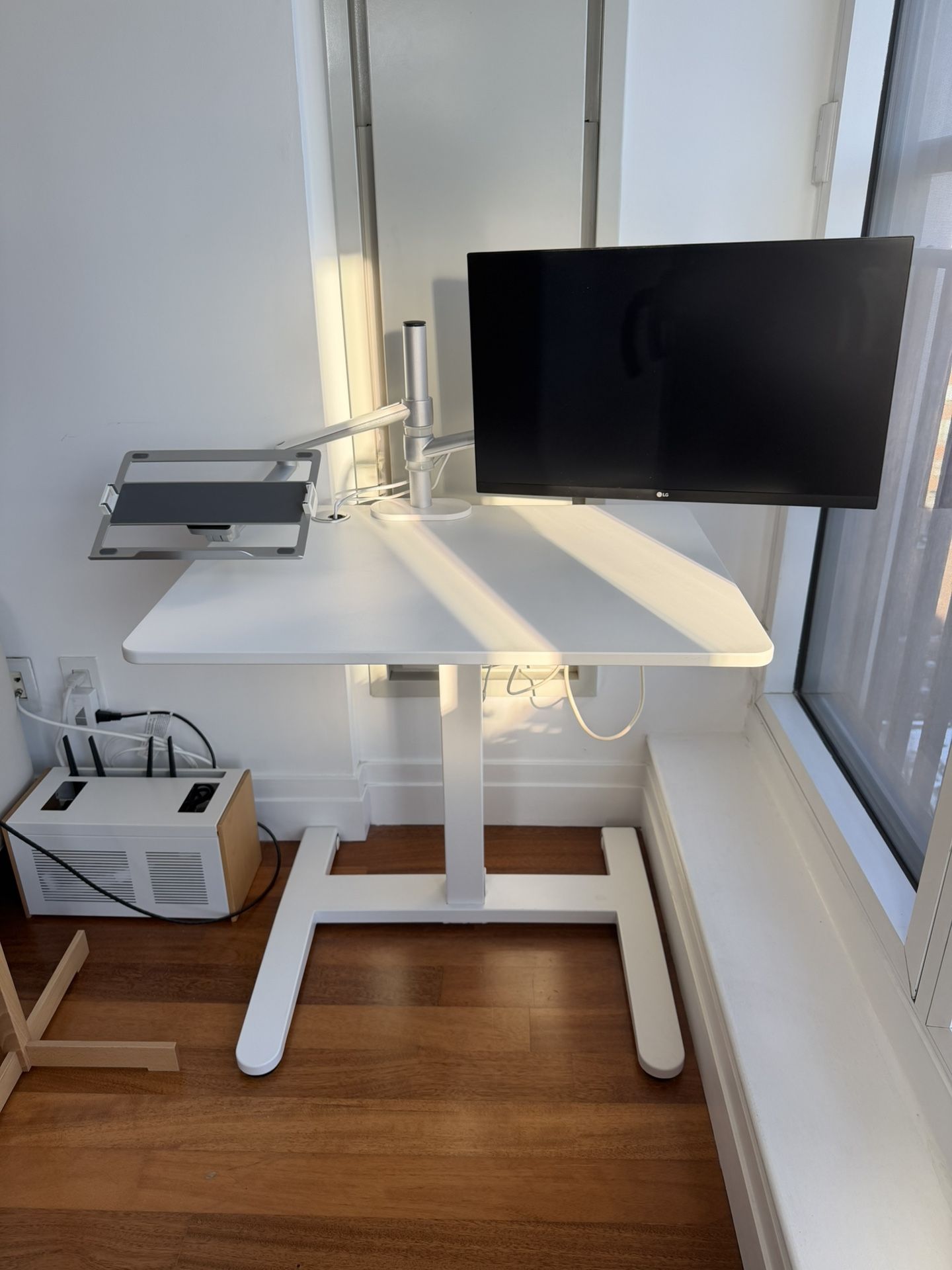 ERGOBOND Compact Pneumatic Standing Desk (White) in excellent condition, fully functional. Desk only for this listing. Monitor arm and monitor shown in photos are not included. I also have a separate post for a complete work-from-home bundle if you’re interested. • Desktop size: 32” W x 24” D • Height adjustable: 29.5” – 47” • Manual pneumatic lift (no motor, very smooth and quiet) • Stable metal base, easy to move Pickup only in Murray Hill/ Midtown East, Manhattan. Moving sale.